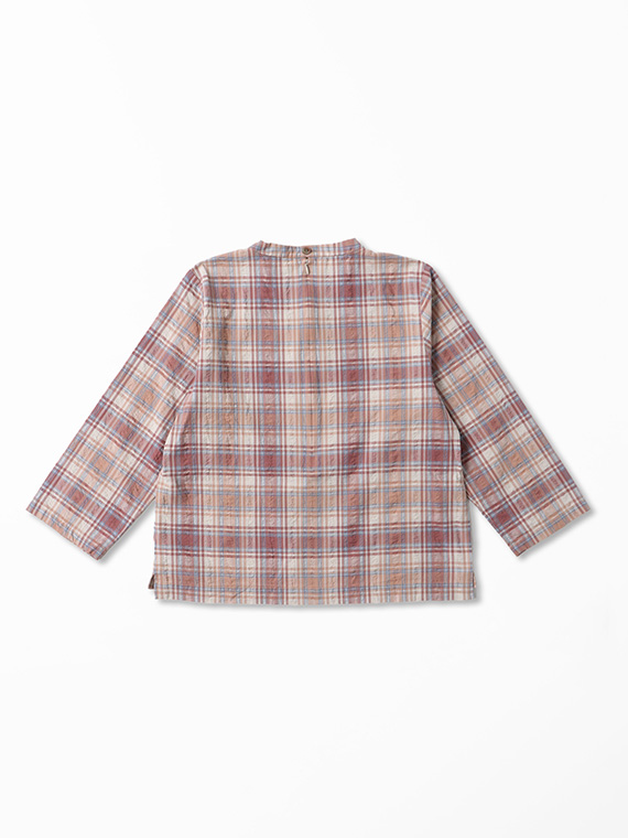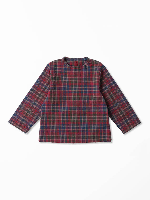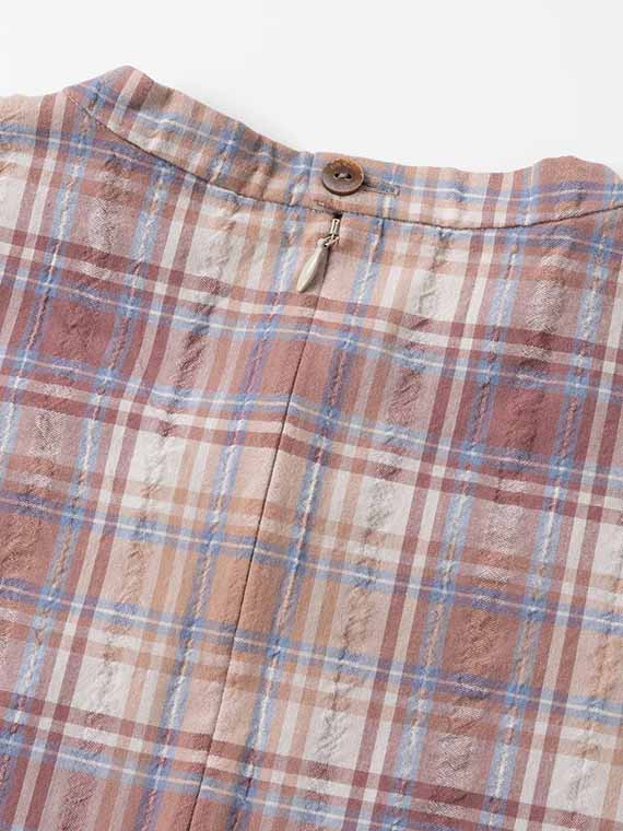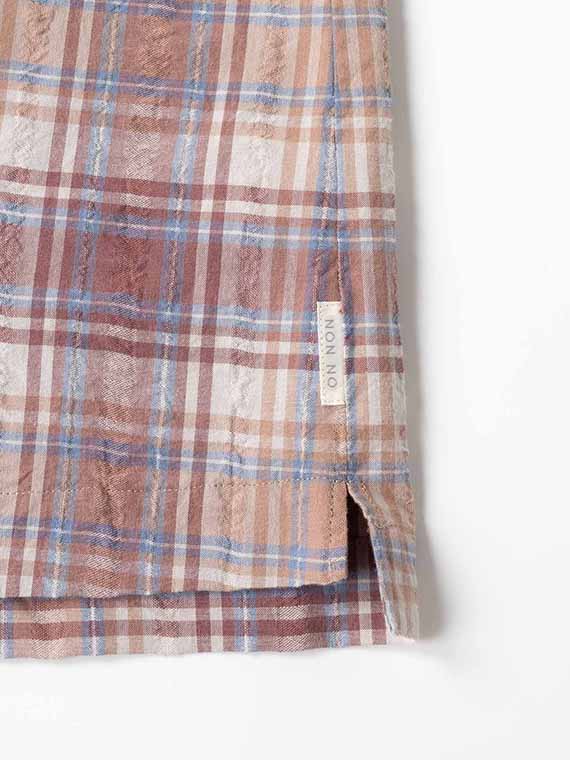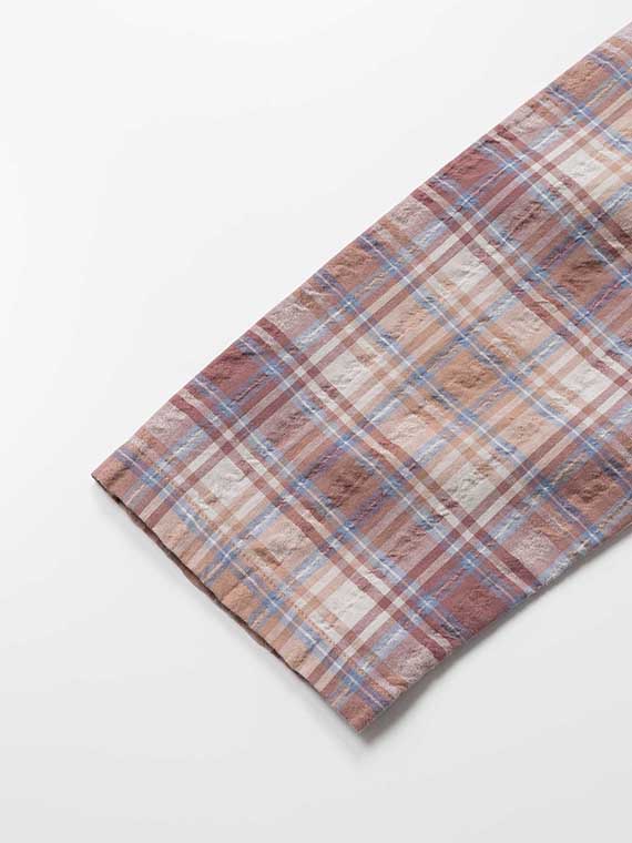 タテ・ヨコ糸ともに30/1コットンを使用したドビー織りチェックです。意図的にタテ糸を部分的に配列を変えることにより糸の収縮差でサッカーの様な独特の凹凸感のある表情を生み出しています。仕上げ加工にてワッシャー加工を施し、ソフトでナチュラル感のある風合いと晩夏から初秋に相応しいこっくりとしたチェックの色合いに仕上げました。
