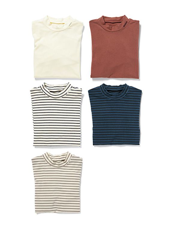 この素材はアクリルレーヨンの混紡糸を28Gで編み立てしています。アクリルは特殊なファイバーで構成されていて、染色整理加工後にバルキー性(膨らみ)が出る特徴があります。糸の膨らみとアクリルレーヨンの持つしっとりとした柔らかさとしなやかさを兼ね備えた、肌心地の良い素材に仕上がっています。ボーダーはスタイリングしやすいカラーで3色に増やして展開しています。ムジは2色展開。