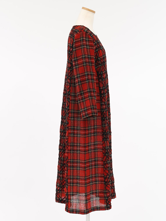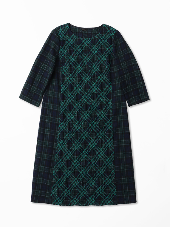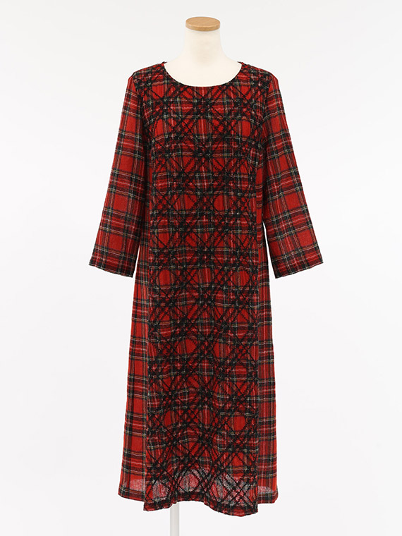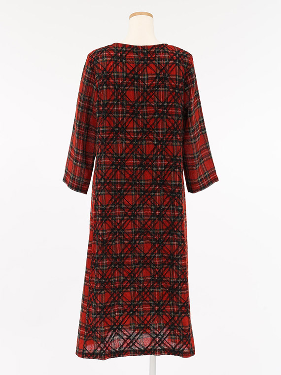 前後の身頃に刺繍がほどこされたタータンチェックのロングワンピースです。