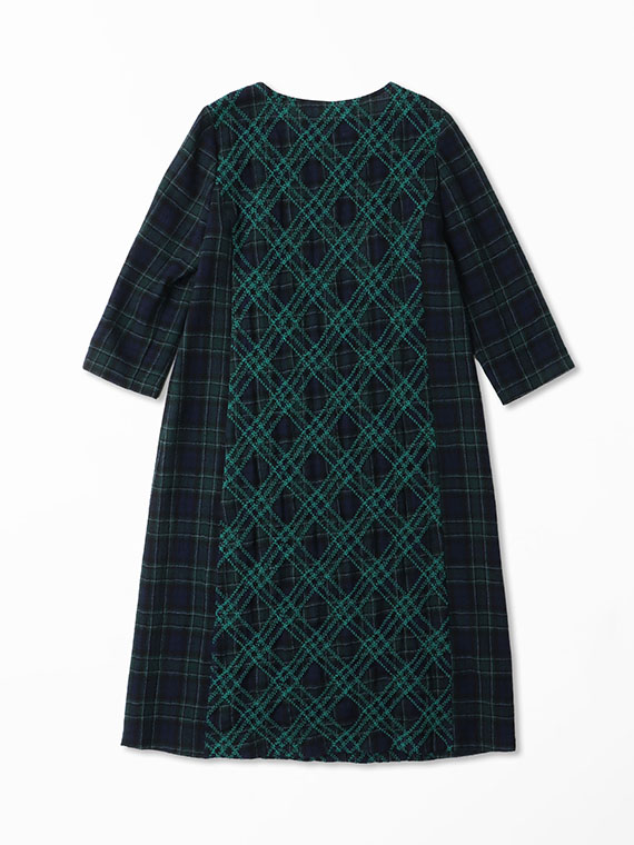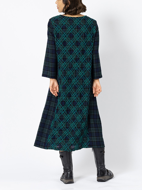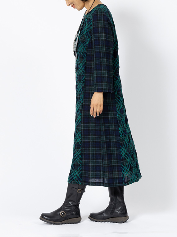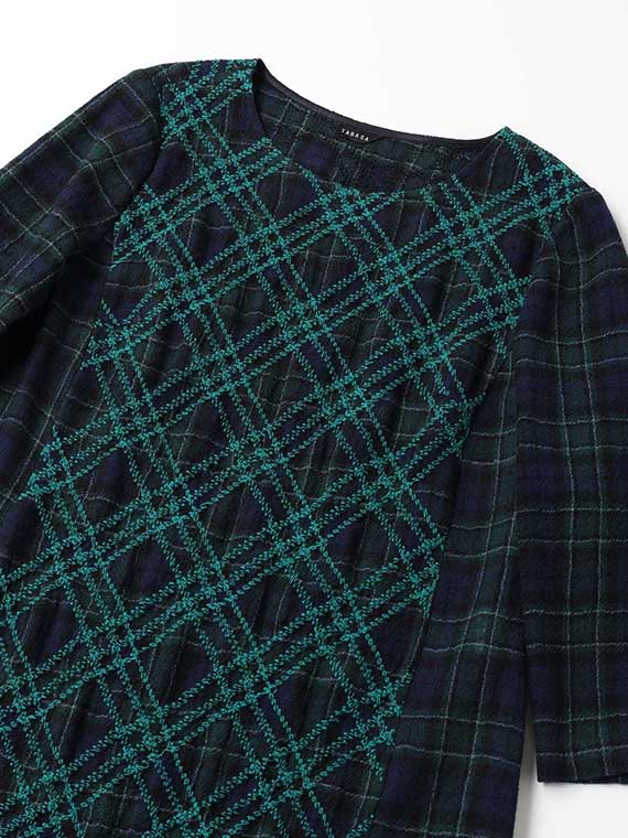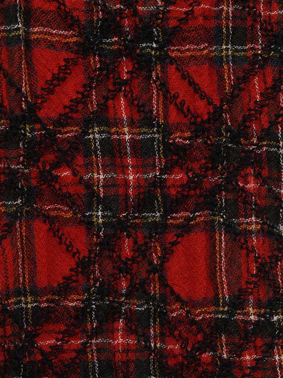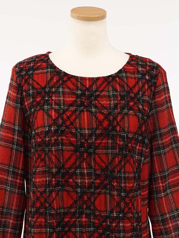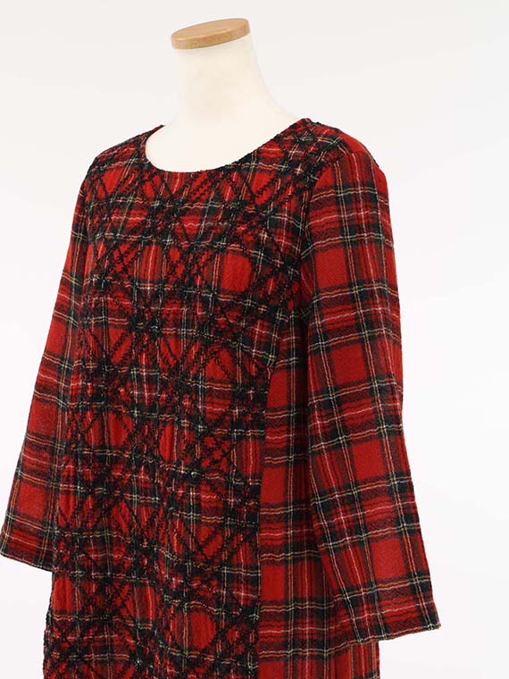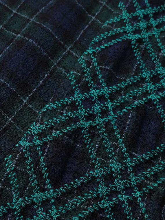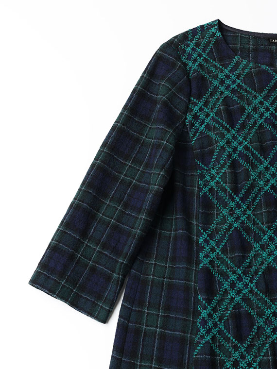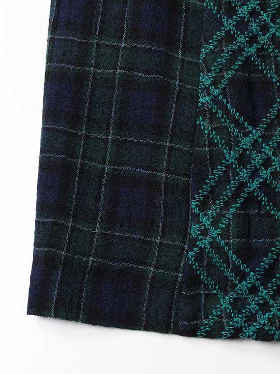 刺繍はバイアスチェック柄の収縮刺繍で、タータンチェックの生地の上に『チェックonチェック』でほどこされ、パネルのようにはめ込まれています。