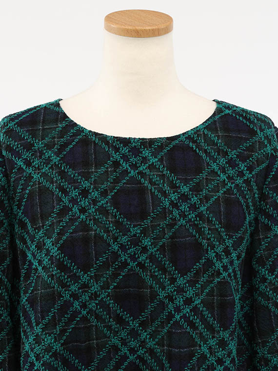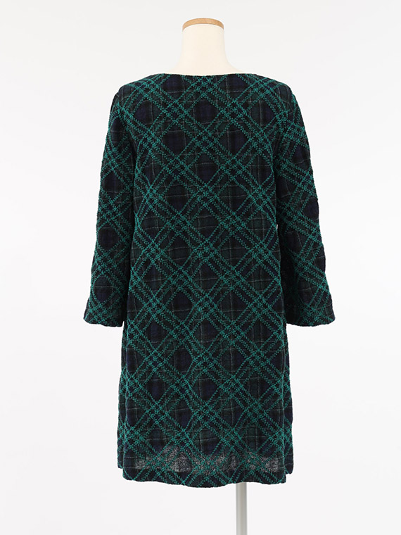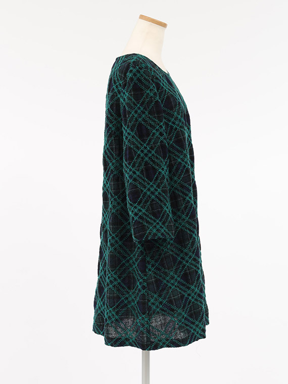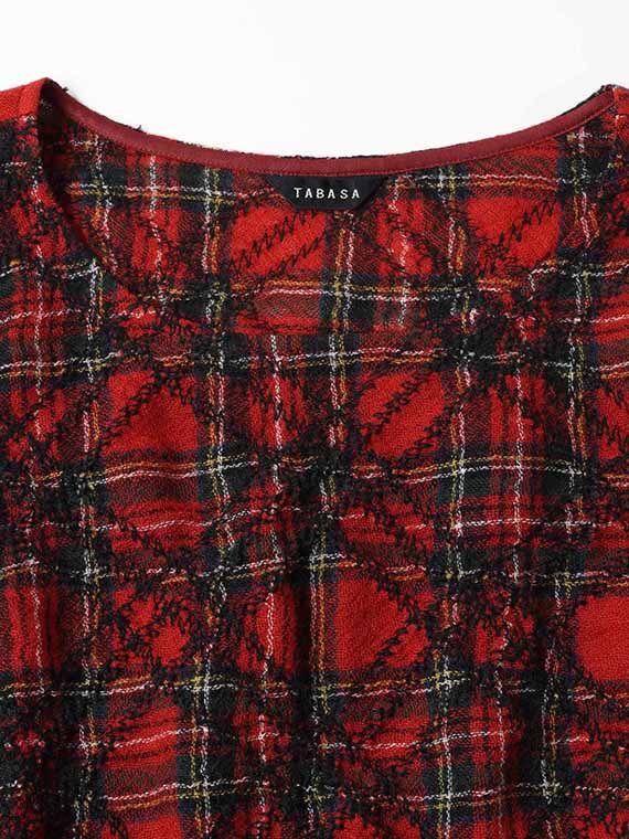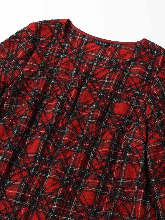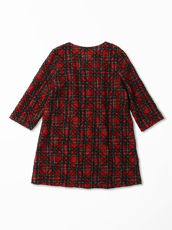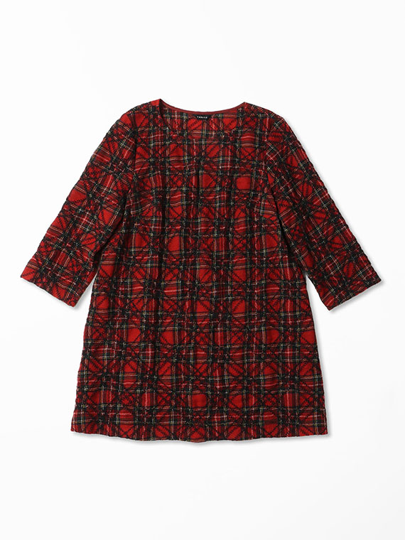 バイアスチェック柄の収縮刺繍がほどこされたタータンチェックの生地で仕立てられたAラインシルエットのチュニックです。