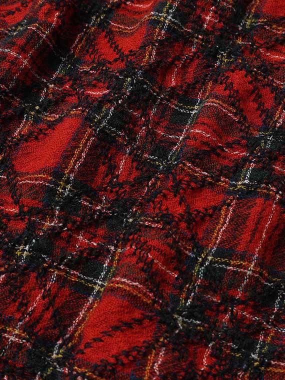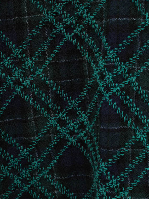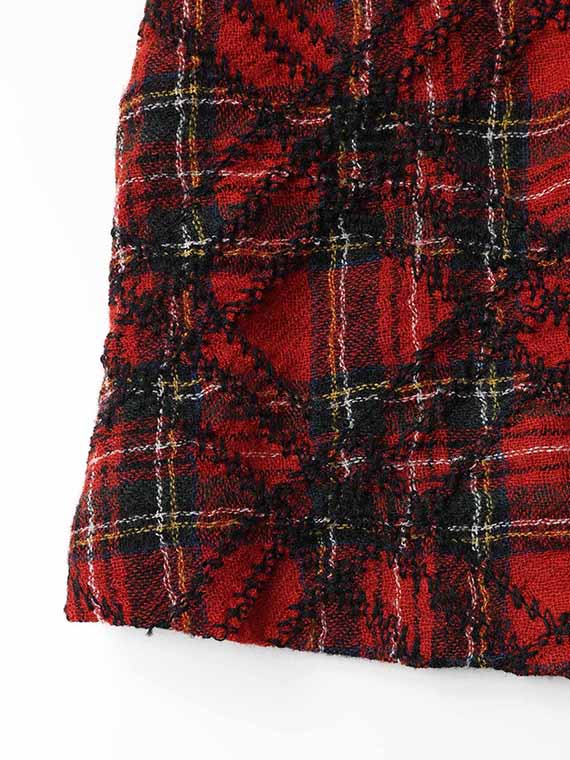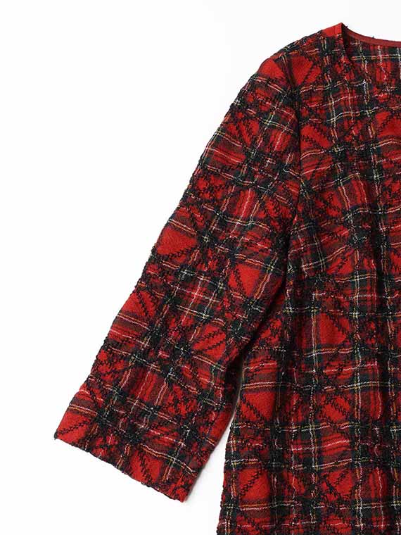 タータンチェックの生地の上に『チェックonチェック』でほどこされたバイアスチェック柄の収縮刺繍は、凹凸感があることで独特な表情がうまれ、より温かみを感じられるような仕上がりです。