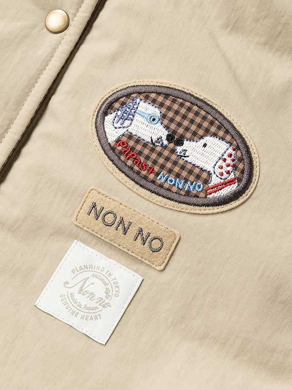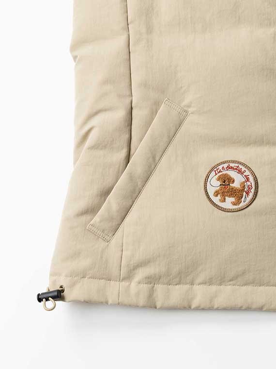 犬モチーフで統一し、丸型ワッペンには「It's a beautiful day today(今日はいい天気)」と入れました。お散歩やお出掛け時におすすめです。表地が綿タッチなので、初秋のTシャツ合わせ~春先まで3シーズンと長くご着用いただけます。同素材を使用したフード付きステンカラーブルゾンもございます。