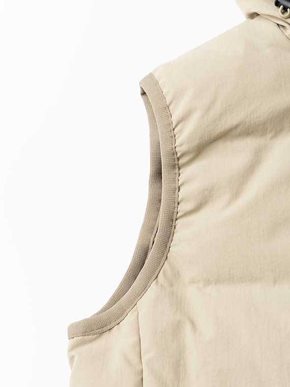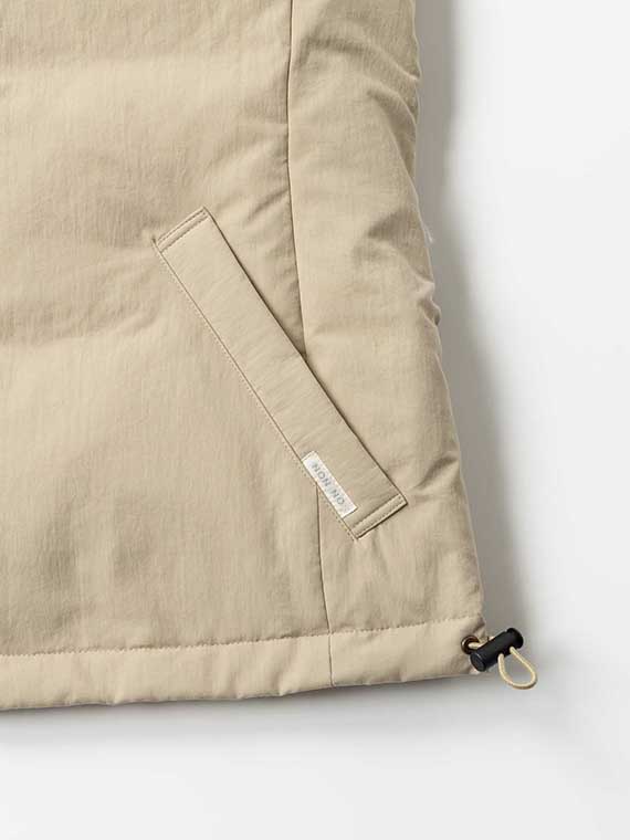 タテ糸には70Dのセミダルナイロン、ヨコ糸には120Dのタスランナイロンを使用し織り上げた平織素材です。タスランナイロンを使用することで合繊100%ながら綿のような天然繊維タッチになり膨らみや柔らかさが出ます。表面にピーチ起毛をかけワッシャー加工を施すことで肌触りの良い柔らかなパウダータッチとウォーム感を感じられるこの素材は、撥水機能も兼ね備えた素材となっています。