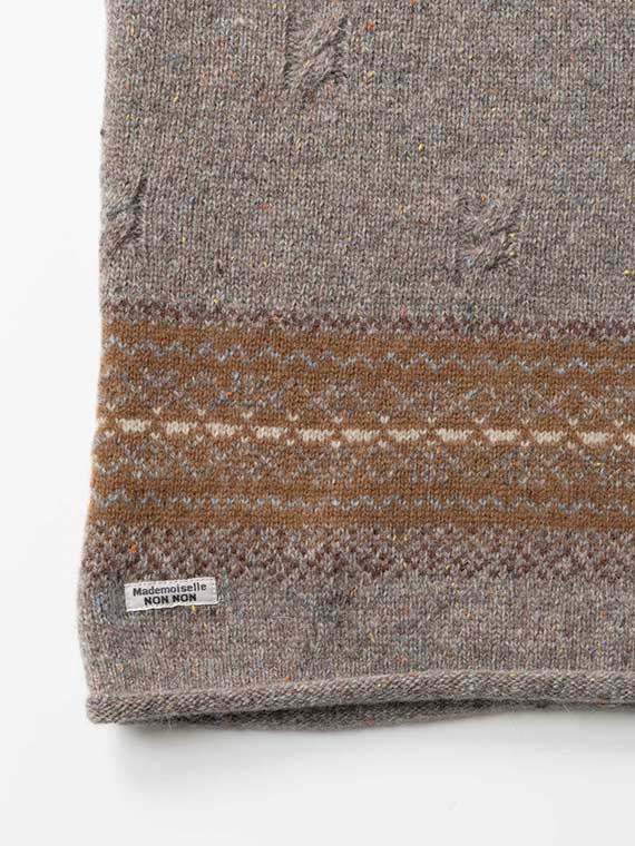 POSH-FCTはFC TWEEDの単糸とPOSH14の単糸を撚糸したオリジナル素材です。柔らかな風合いと保温性、保湿性、シルクネップの表面感が特徴です。〈FC TWEED〉羊毛の産地であるオーストラリアのジロン地方で産出される、メリノ種の生後6ヶ月以内に採取した子羊の毛「エクストラファインラムウール」とアンゴララビットの毛を混紡しました。アンゴララビットの毛質はエクストラファインラムウールと同様にとても柔らかく繊細です。FC TWEEDは1本1本、丁寧に手作業で刺毛を取り除いた「ハンドデイヘアー」を使用しています。これらの素材を厳選して使用する事により、相乗効果が生まれ、保温性、保湿性共に優れ、ぬめり感もある素材になりました。紡毛糸の膨らみを持った暖かな風合いにネップをプラスする事で、ソフトツィード素材に仕上げています。〈POSH14〉オーストラリアのメリノ種と英国長毛種の交配によるカムバック種のラムウールを使用した素材です。毛質はメリノ種の持つ柔らかく肌触りの良い風合いに英国羊毛のスポンディッシュで膨らみが良い特徴を兼ね備えています。この良質な原料を紡績することにより、空気を含み非常に膨らみが良く、軽く暖かな素材となり、優しい風合いで保温性、保湿性、共に優れた糸が出来上がりました。