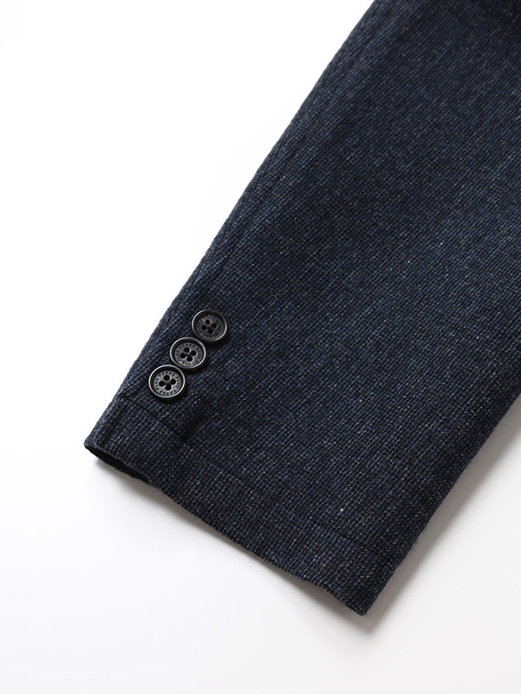 ツイード感がありながらエアリアルな素材にするために紡毛糸の中でも非常に細番手の1/34を使用して織り上げました。1/34は細く軽い糸ですがナイロンを混紡する事で風合いと強度の両立を保ちました。ツイード感、ウォーム感がありながらエアリアルな特徴はこの糸質によるものです。エアリアルなこの素材に少し動きを加える為、16本に1本ナイロンポリウレタンを巻きつけた1/34を配置することでやさしい凹凸感を作り出しました。
