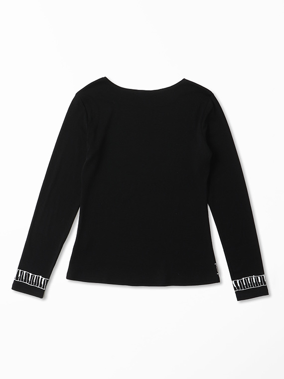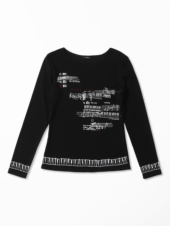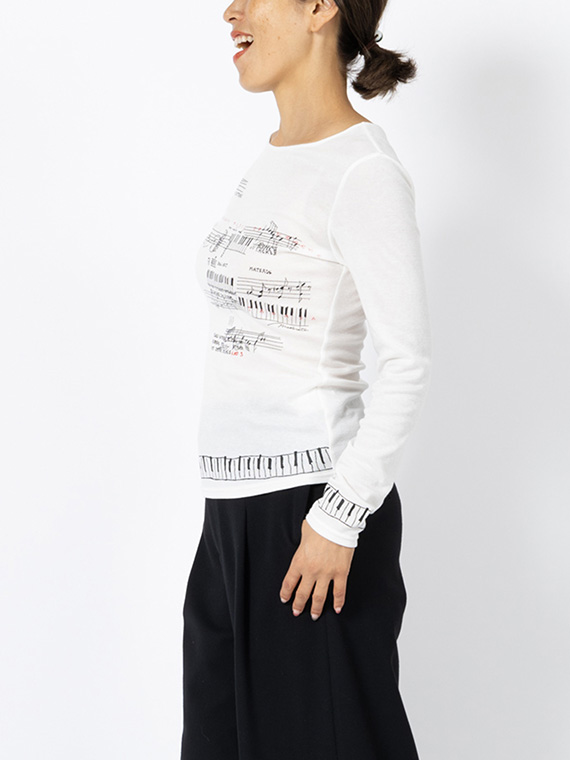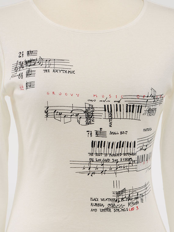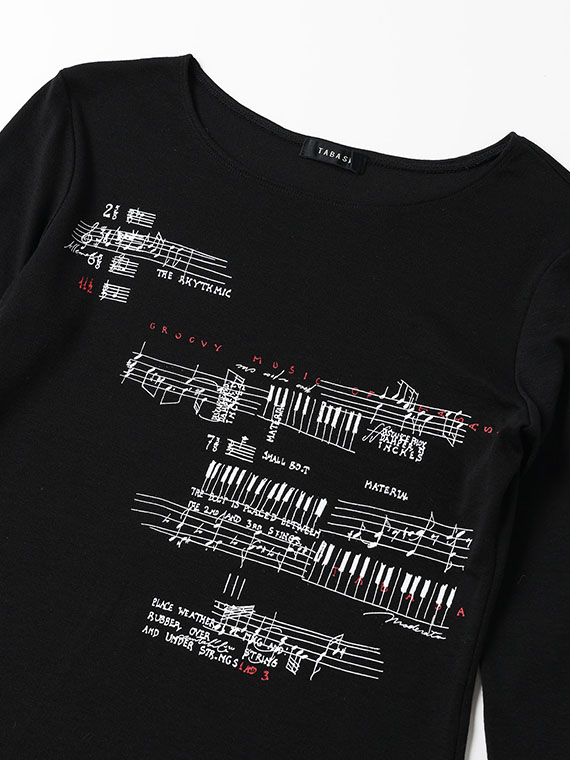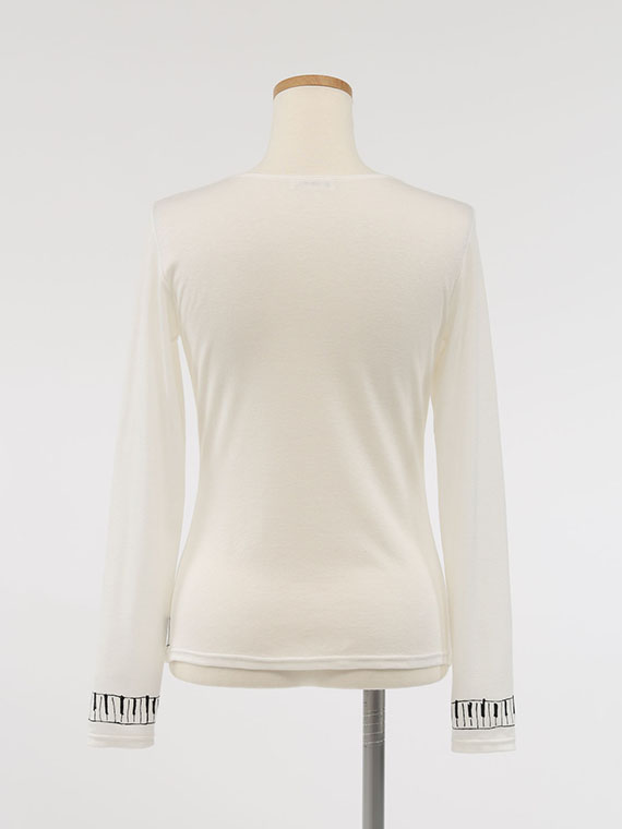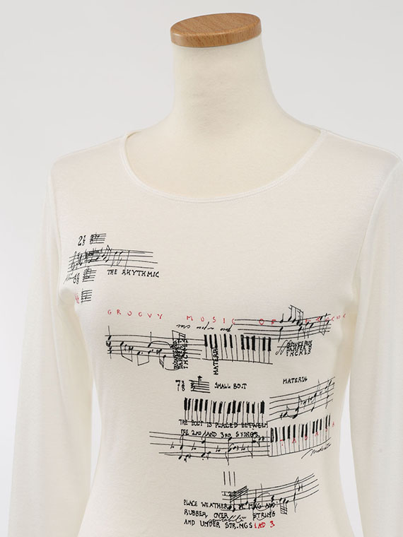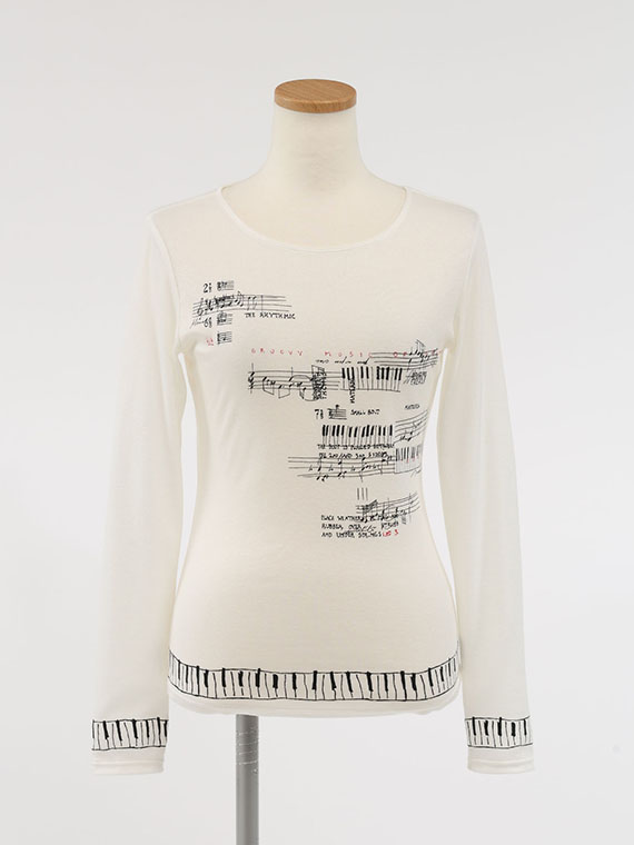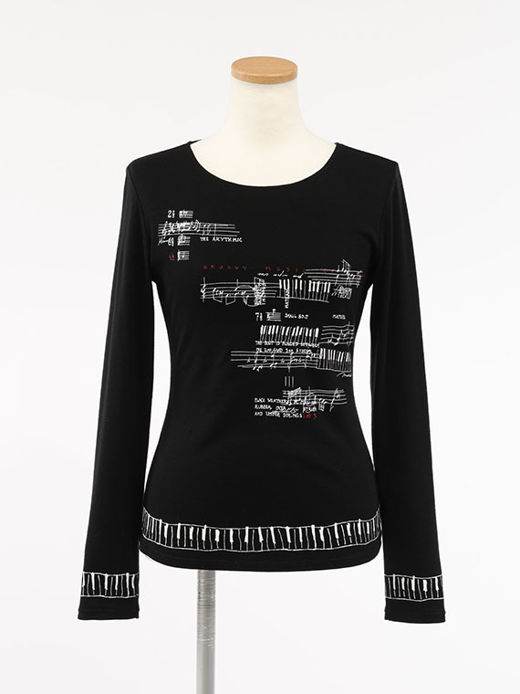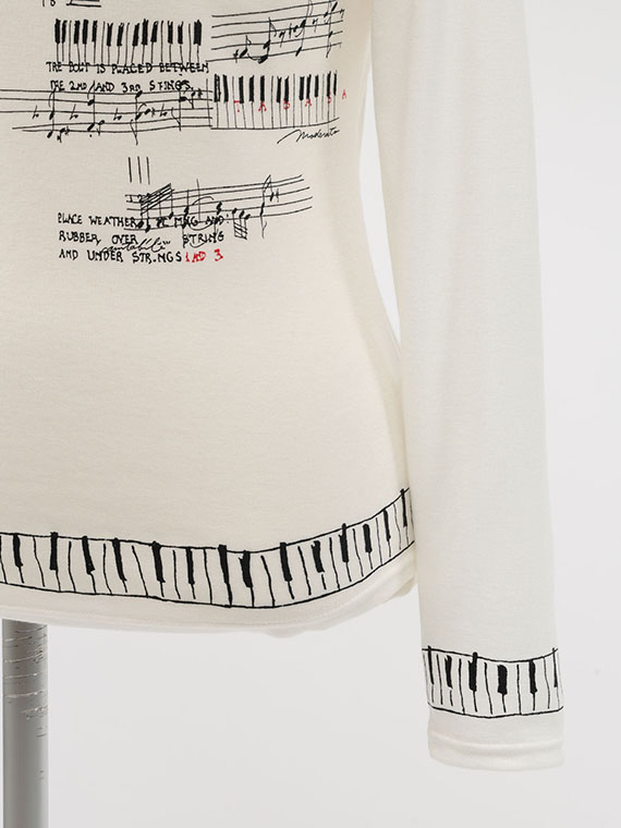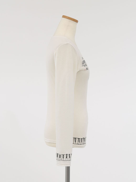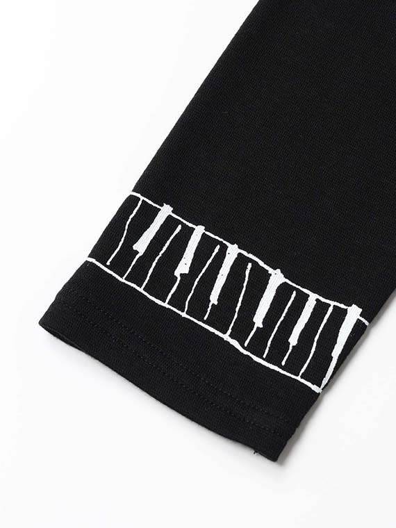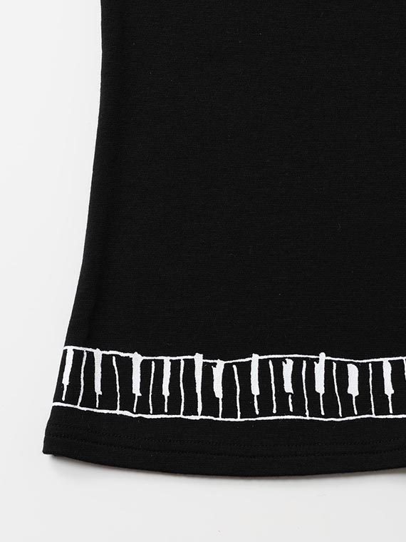 裾や袖口にまで鍵盤がプリントされ、楽しい雰囲気を演出します。