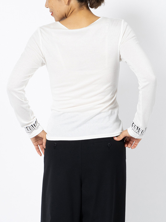 肌あたりが良く、ストレッチ性がありながらも柔らかなふくらみ感のあるハーフミラノリブ素材を使用し、温かみを感じられる一枚に仕上げました。