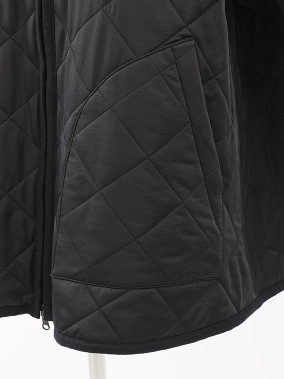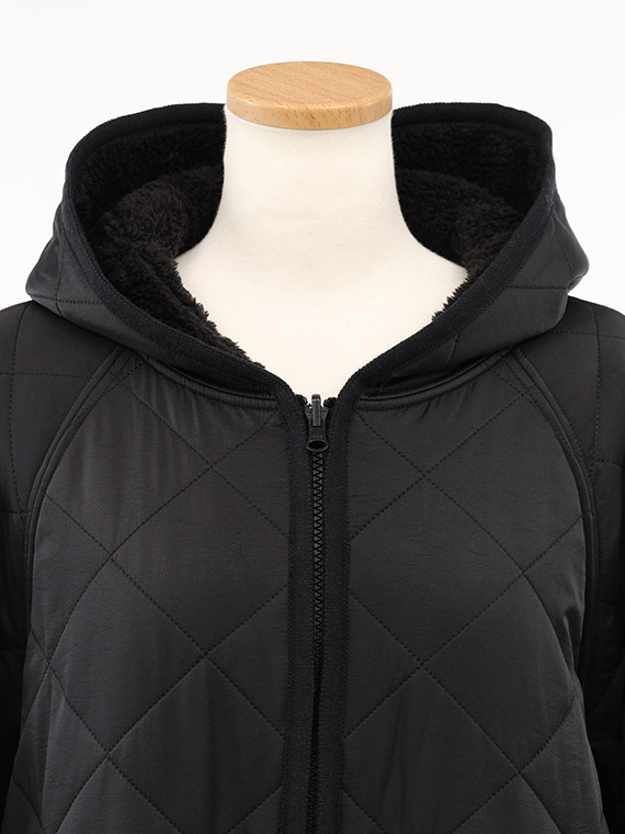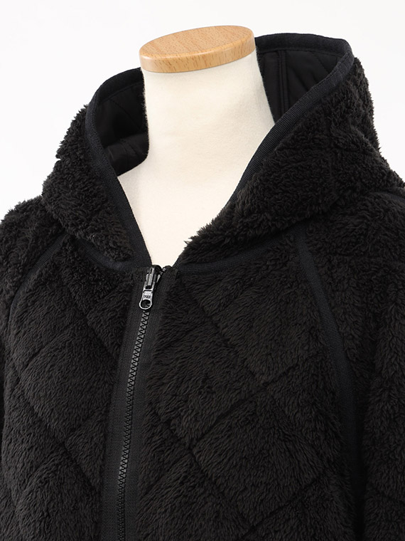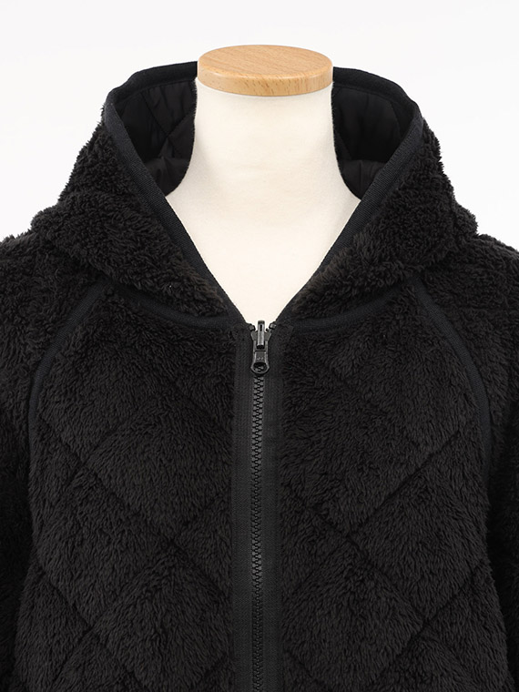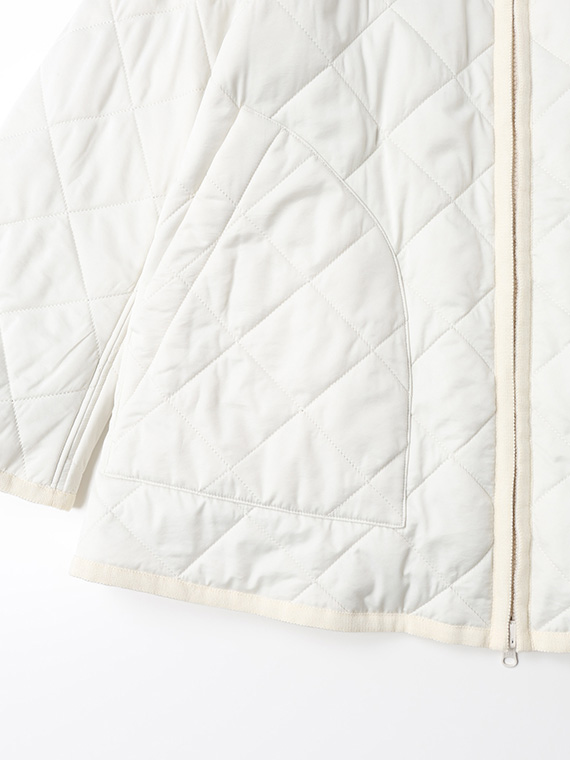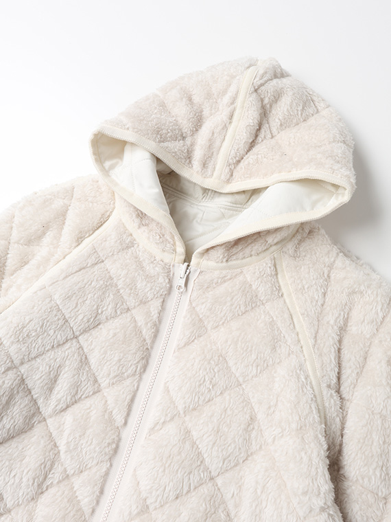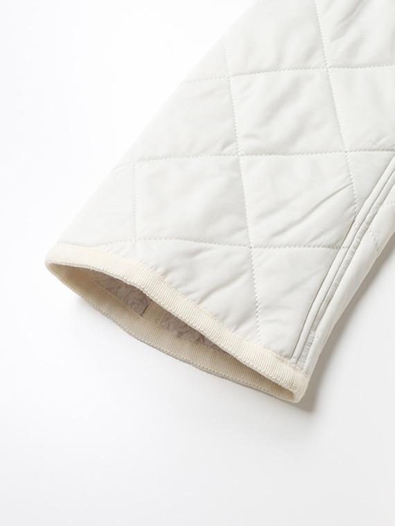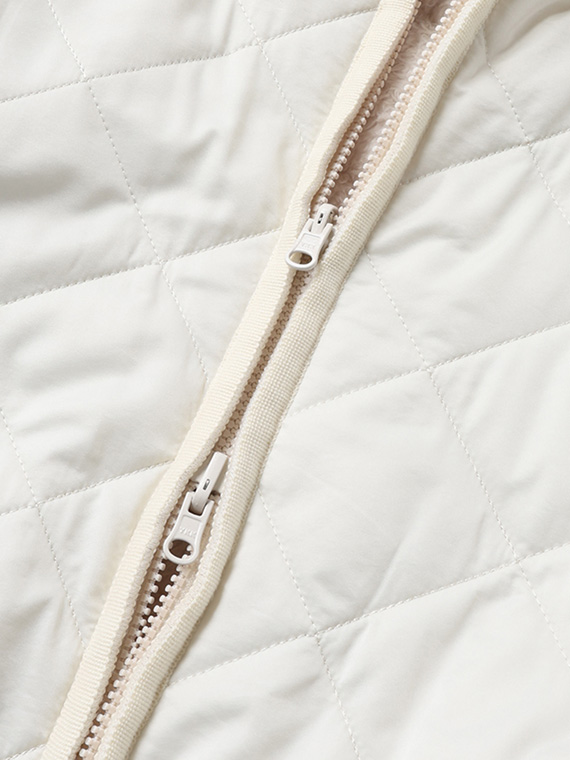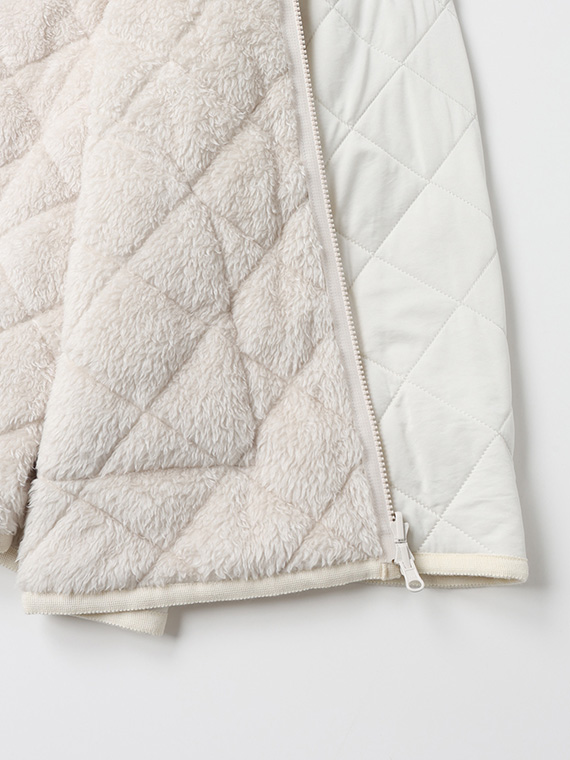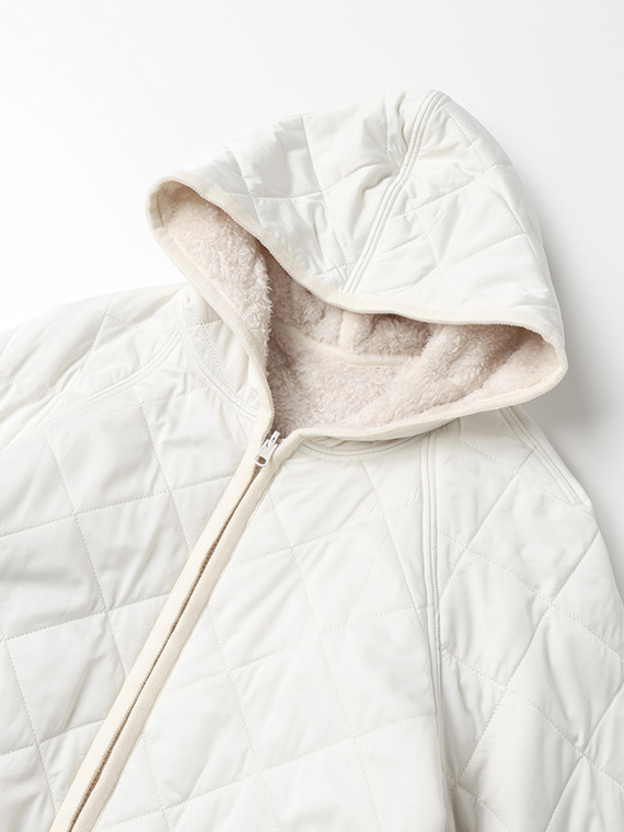 片面はやわらかでマットな風合いのポリエステル/ナイロンタフタで、もう片面は軽く肌ざわりに良いロングボアで、その間に中綿をはさんでダイヤ柄のキルティング加工を加えた素材です。