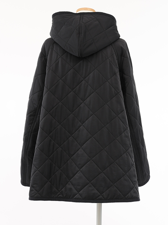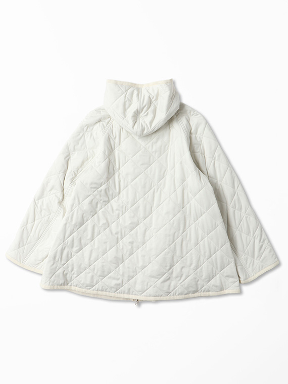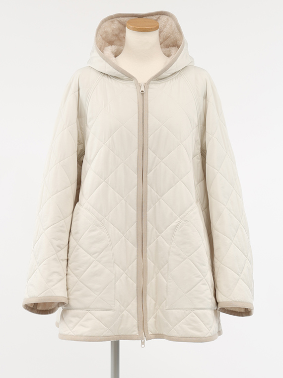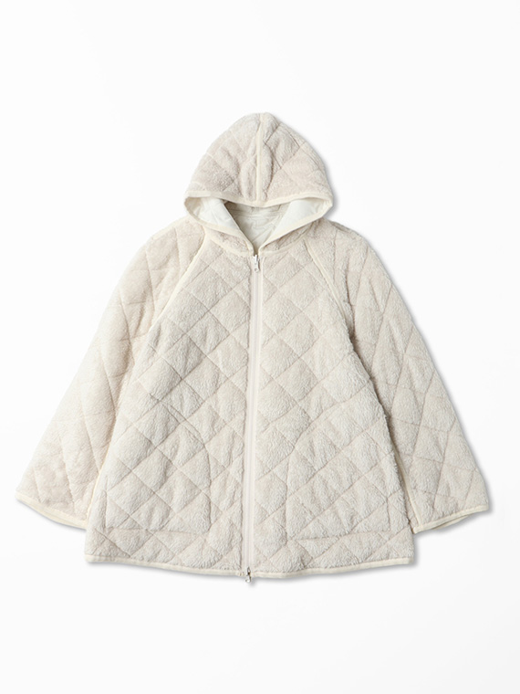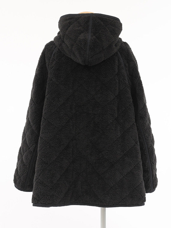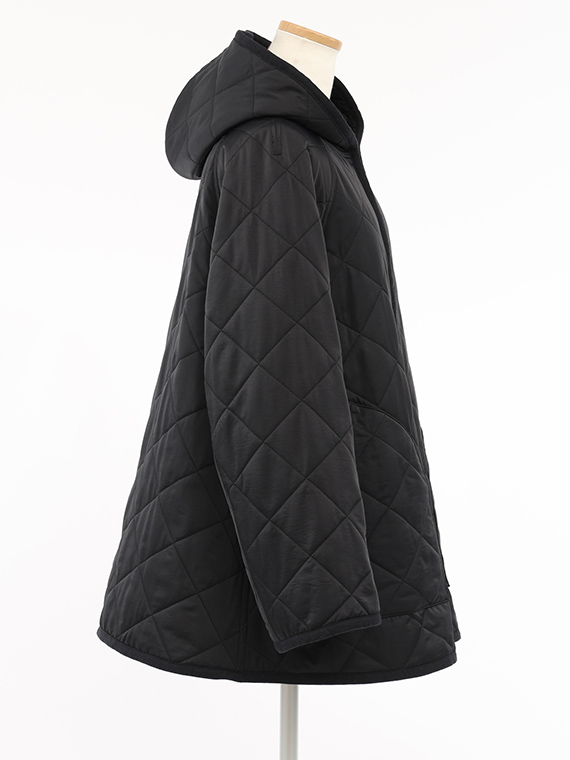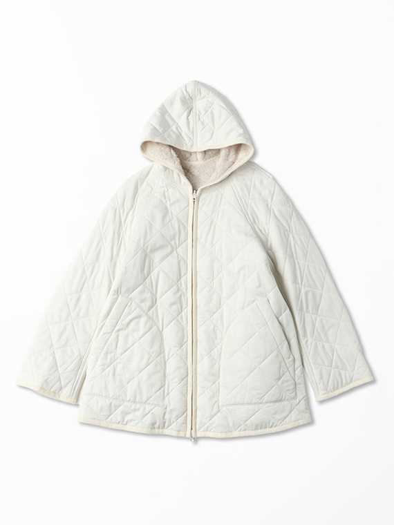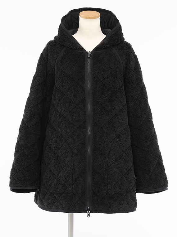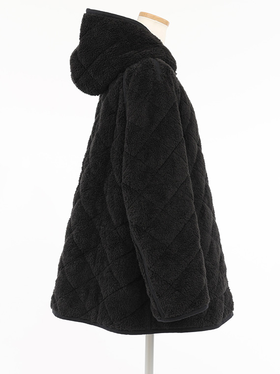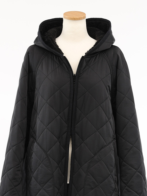 片面はやわらかでマットな風合いのポリエステル/ナイロンタフタで、もう片面は軽く肌ざわりに良いロングボアで、その間に中綿をはさんでダイヤ柄のキルティング加工を加えた素材です。