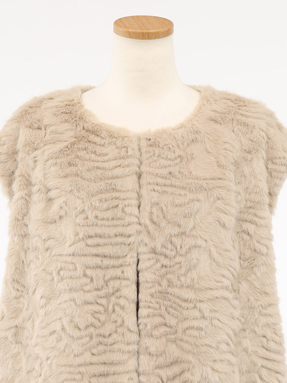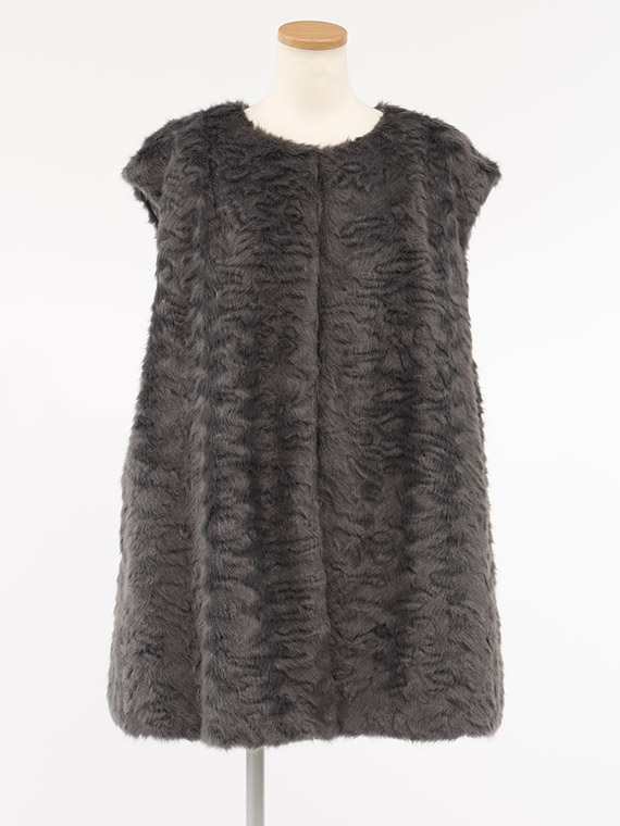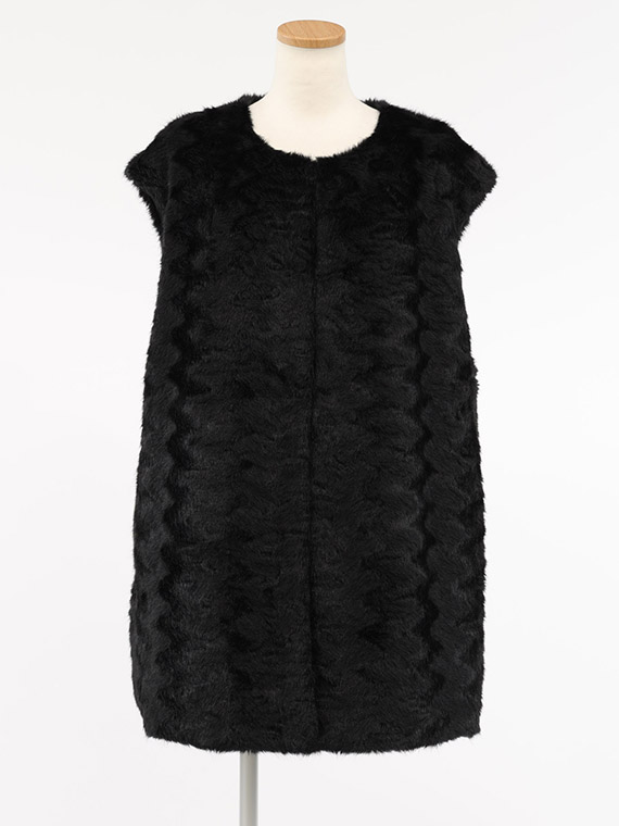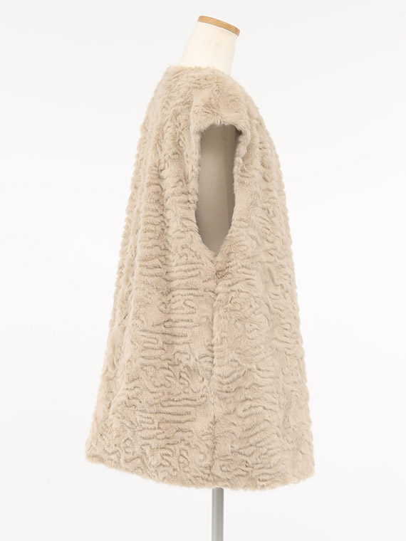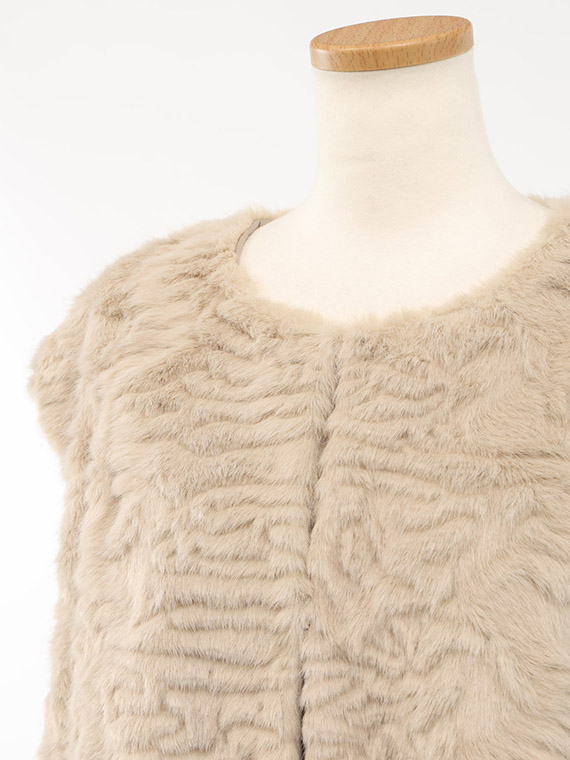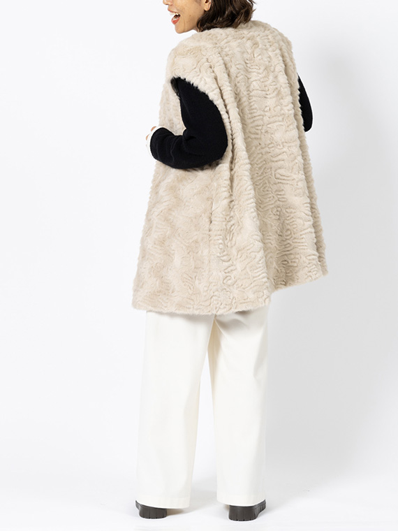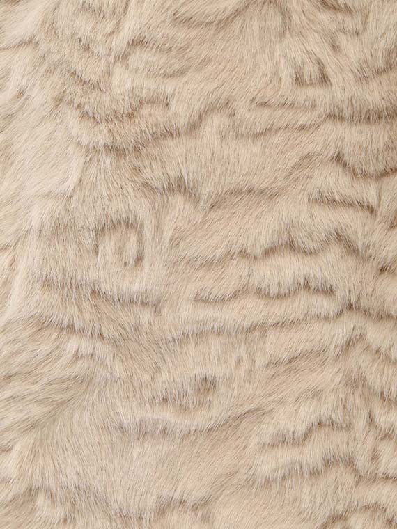 リアルなアストラカンの毛皮は巻き毛と波状の斑紋が特徴ですが、ここではフェイクファーを波のように不規則に刈りこみ、光沢のあるビロードのような質感を表現しました。