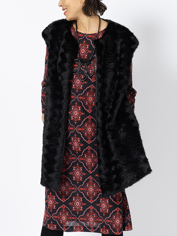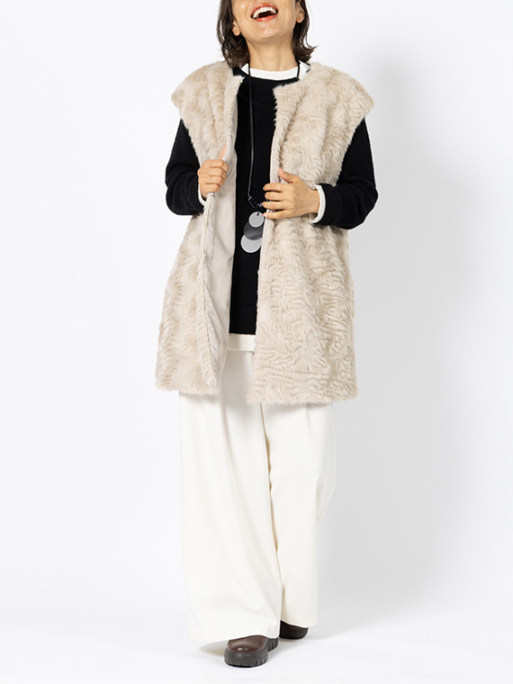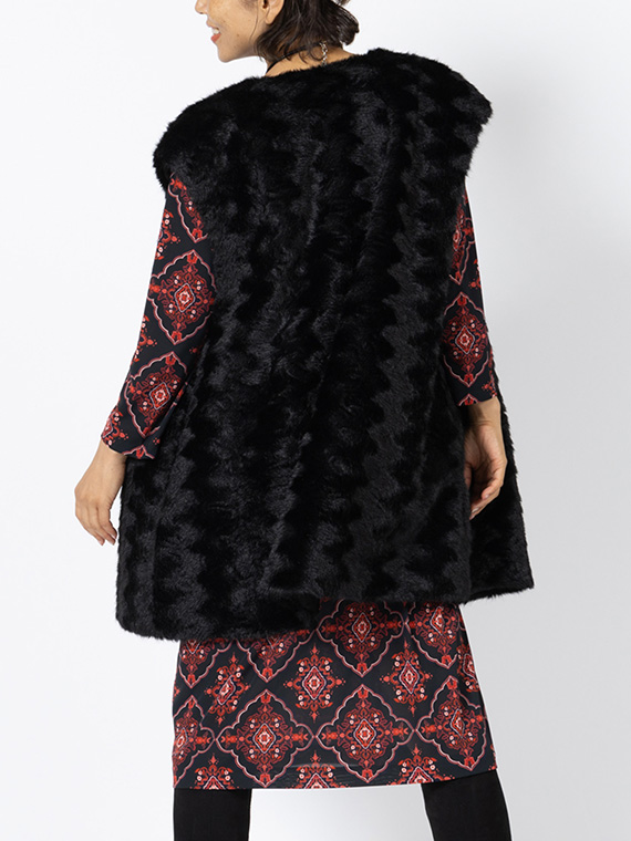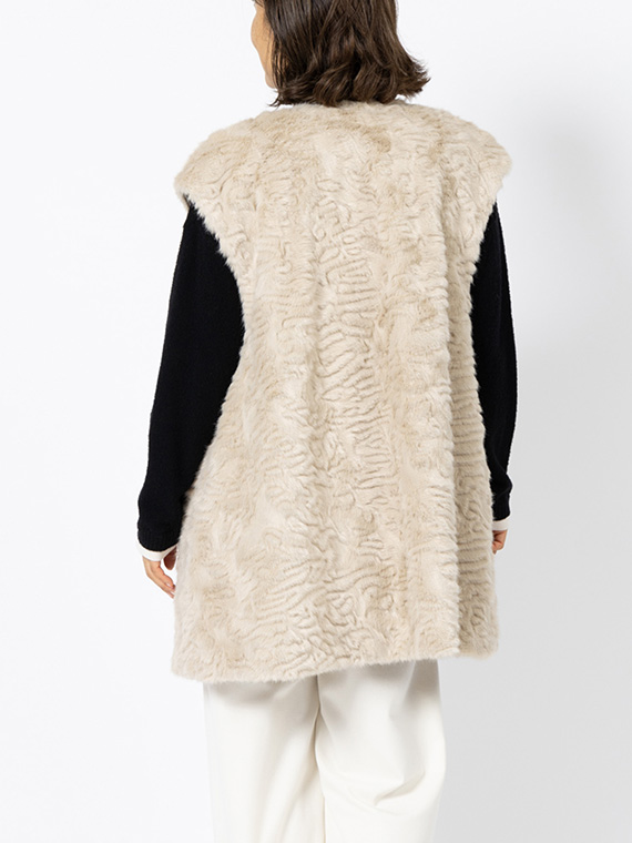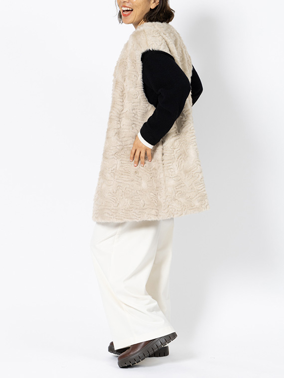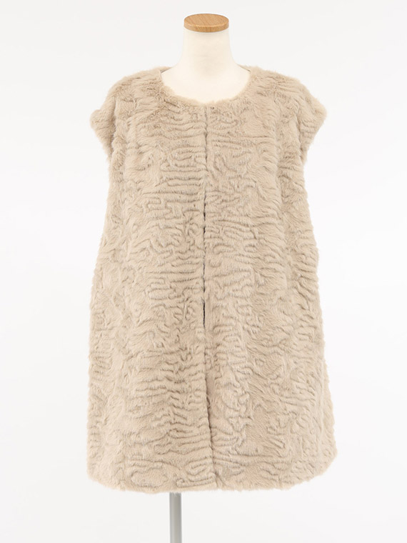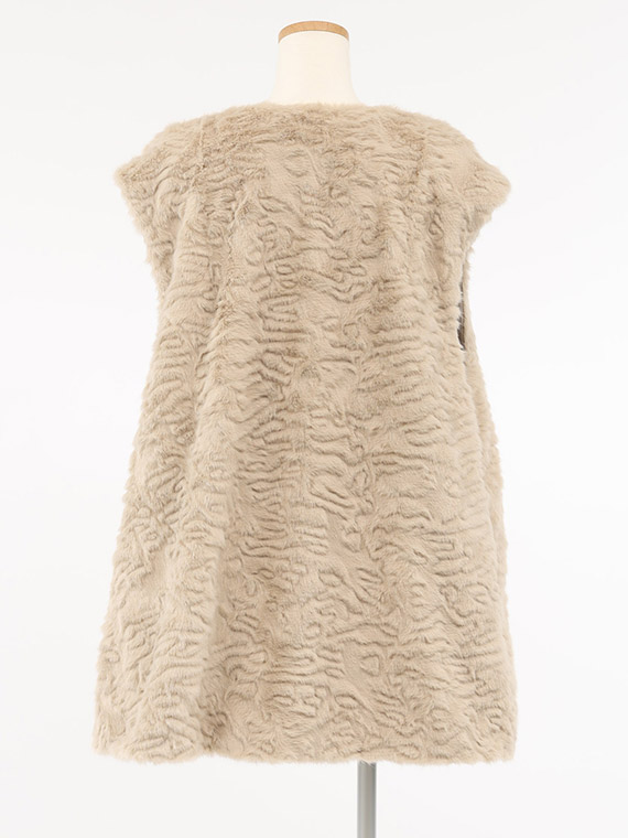 リアルなアストラカンの毛皮は巻き毛と波状の斑紋が特徴ですが、ここではフェイクファーを波のように不規則に刈りこみ、光沢のあるビロードのような質感を表現しました。