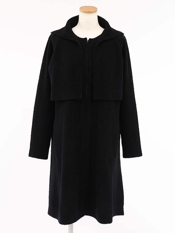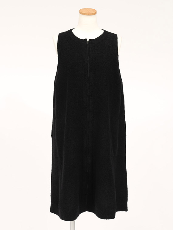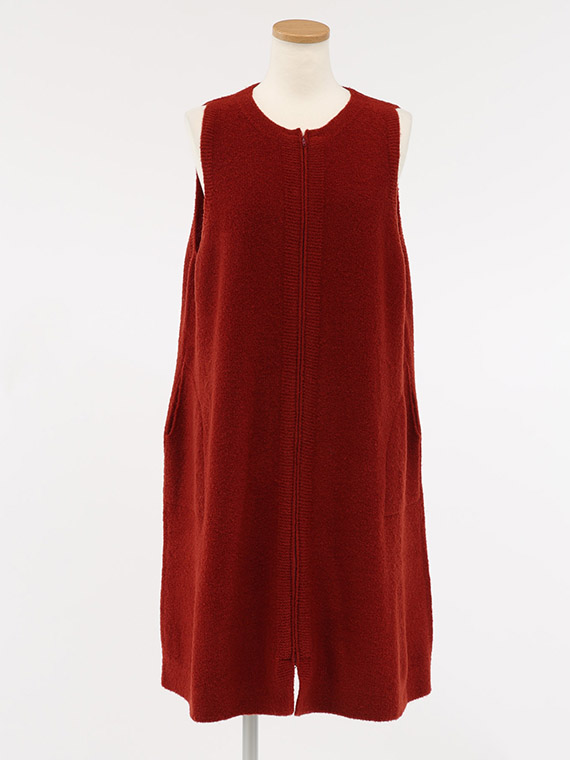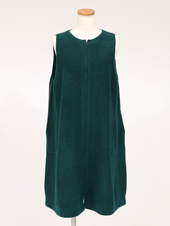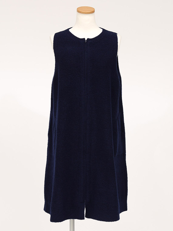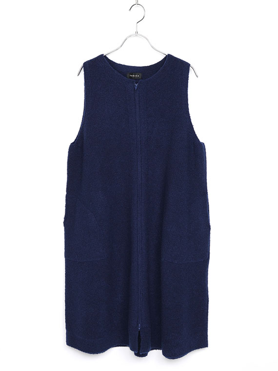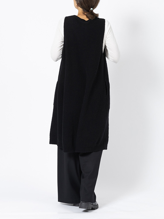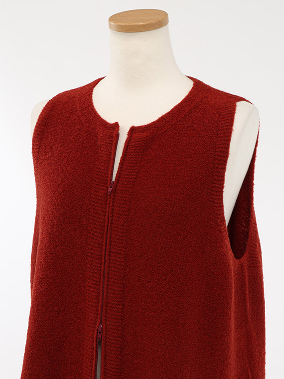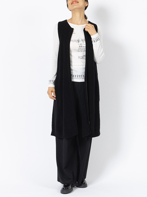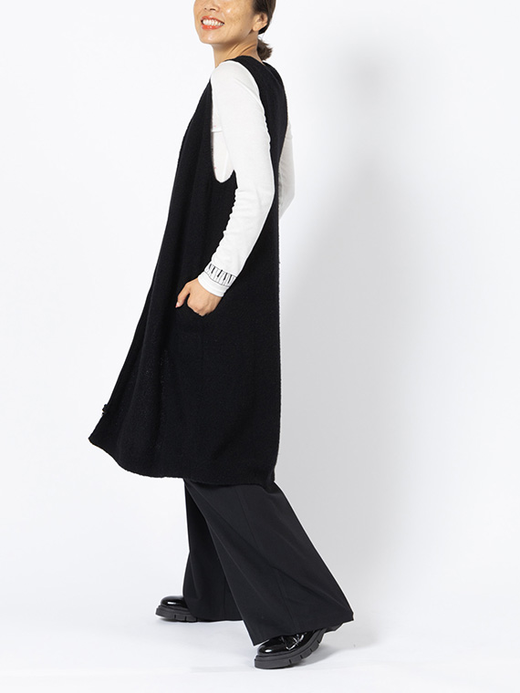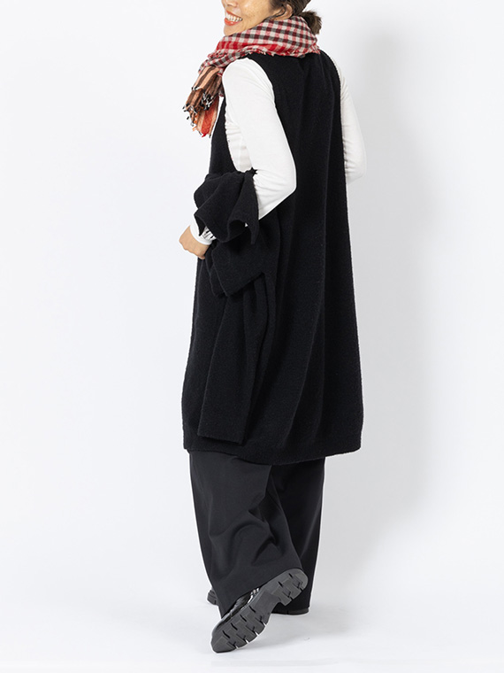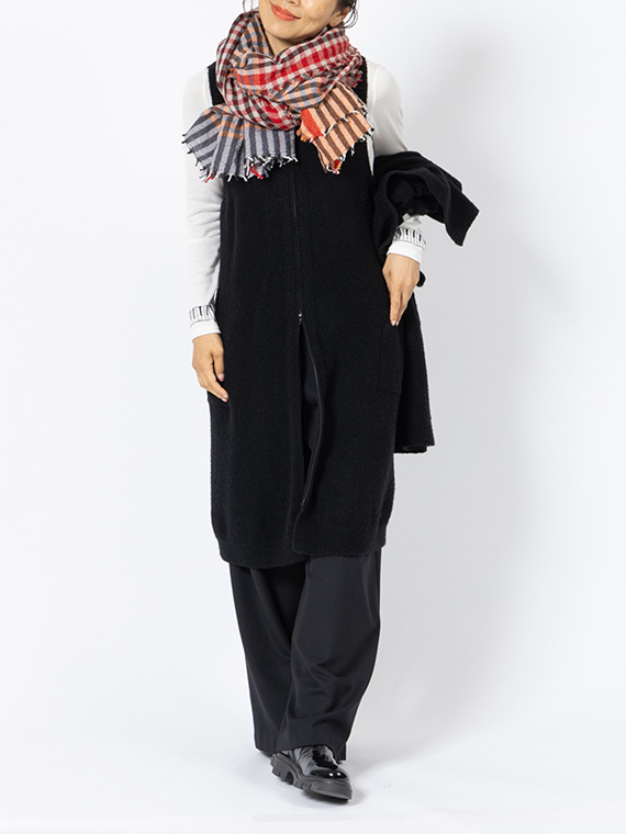 ベストはAラインシルエットで、身体のラインを拾わずにお召しいただくことができ、上からも下からも開けられるファスナーでお好みで前開きを工夫できます。