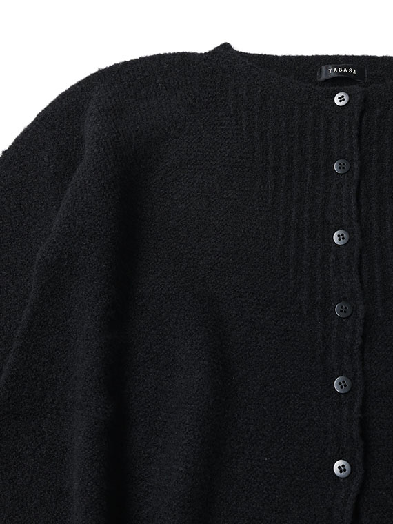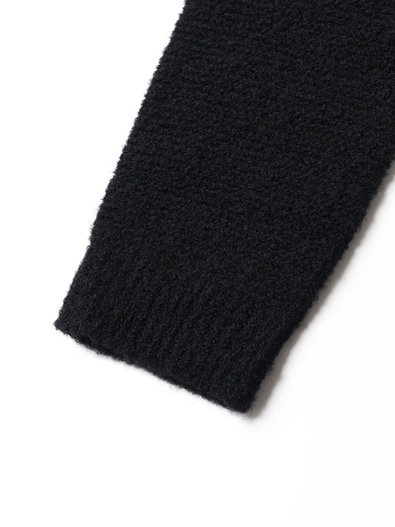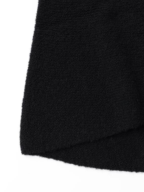 編むことで表面に糸の輪っかが出てモコモコとした肌ざわりや見た目になり、フェミニンで暖かな印象がある素材です。
