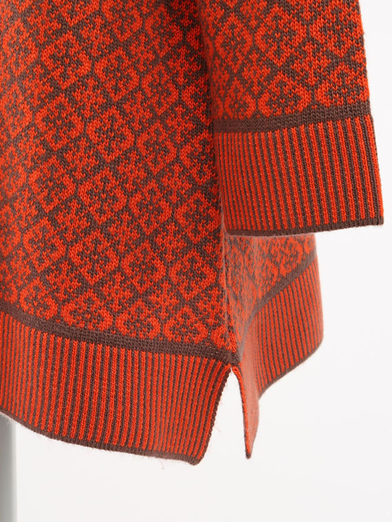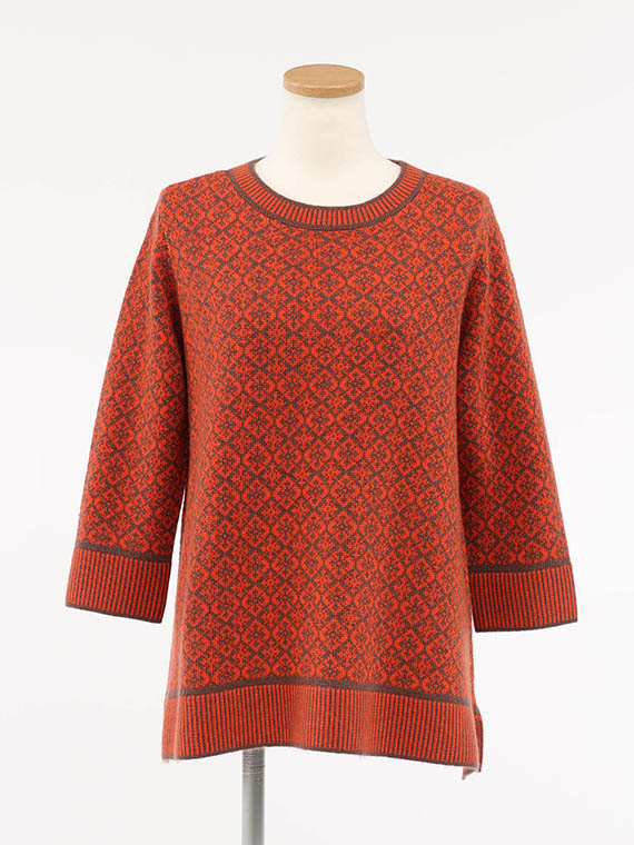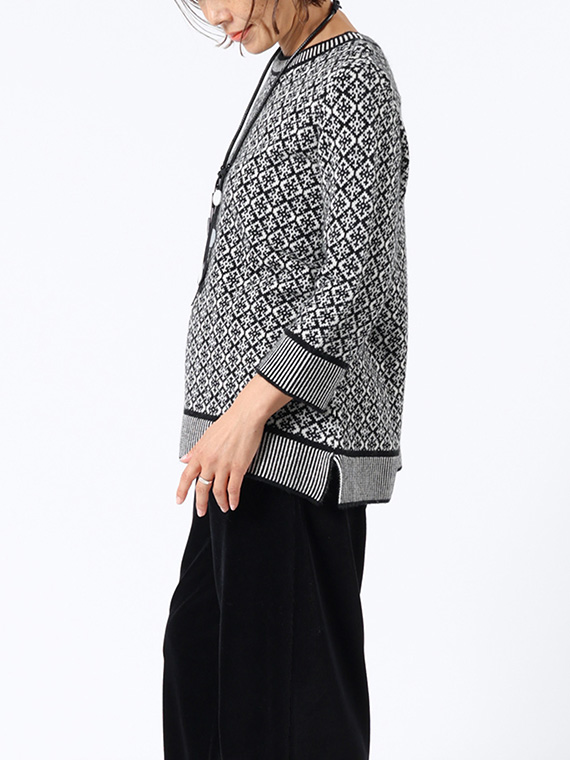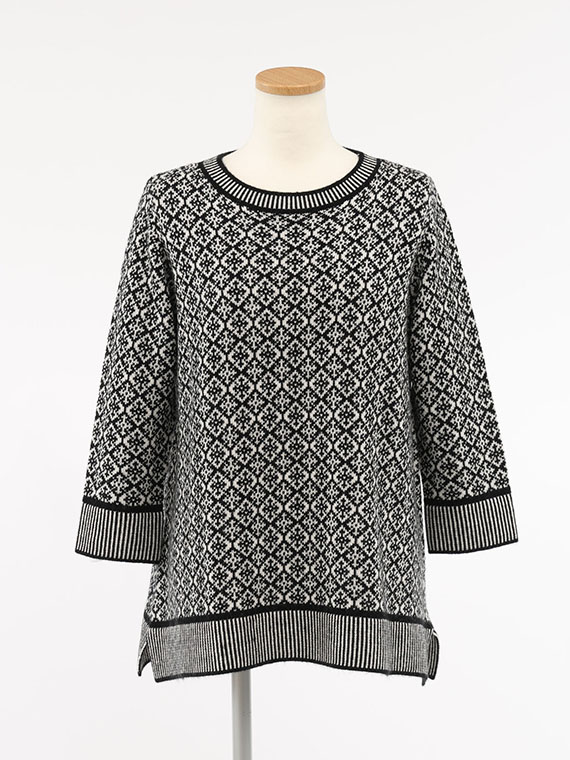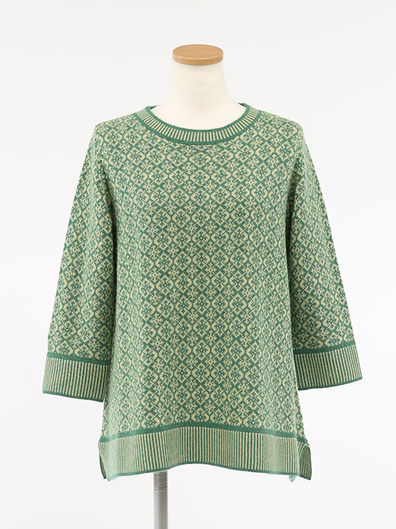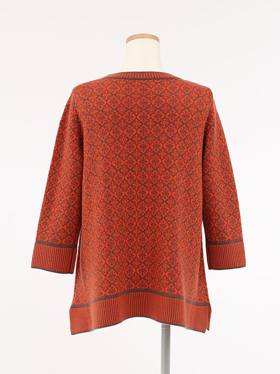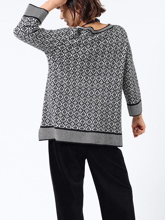 温かみを感じるノルディックパターンの身頃&袖をキヒノヴィッツを意識したトリミングでまとめています。