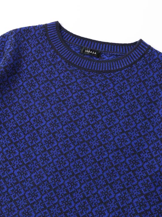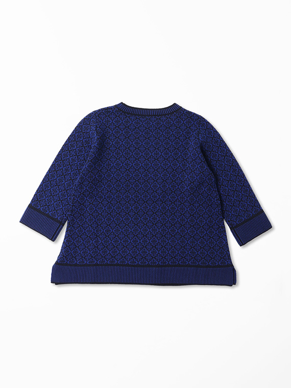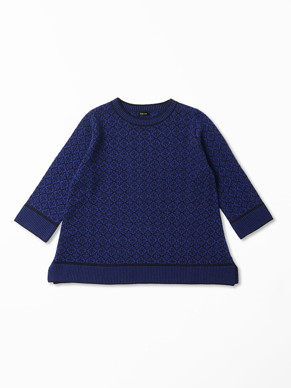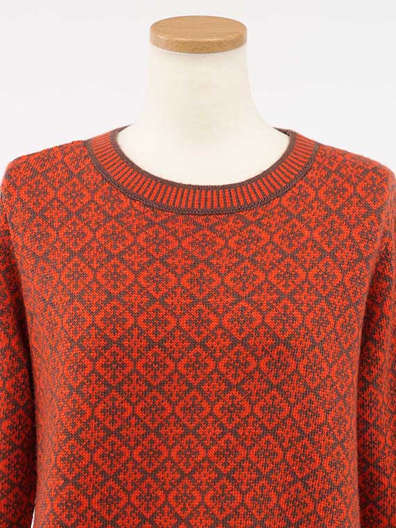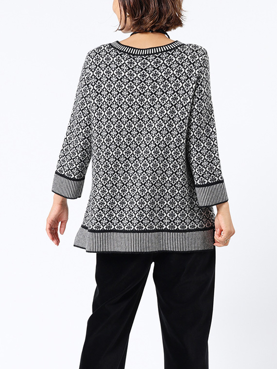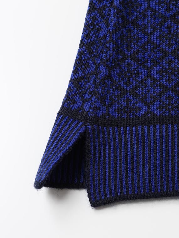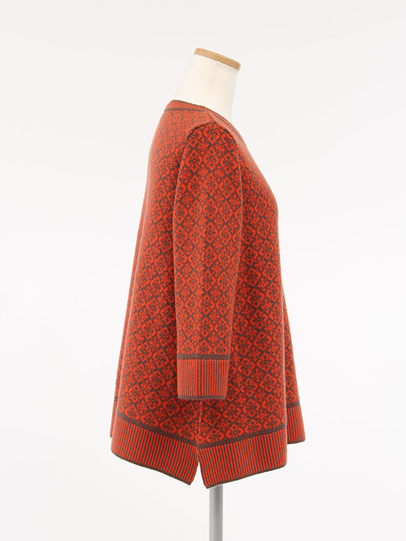 温かみを感じるノルディックパターンの身頃&袖をキヒノヴィッツを意識したトリミングでまとめています。