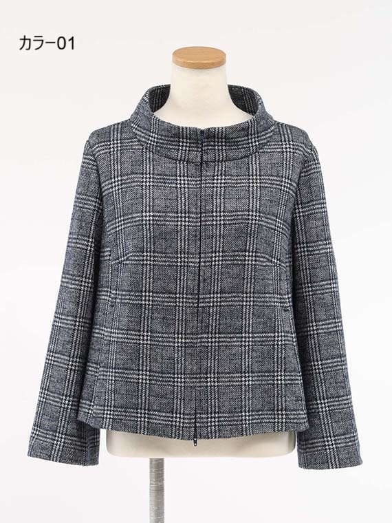首にほど良く沿って立ちあがったボトルネックのジップアップジャケットです。