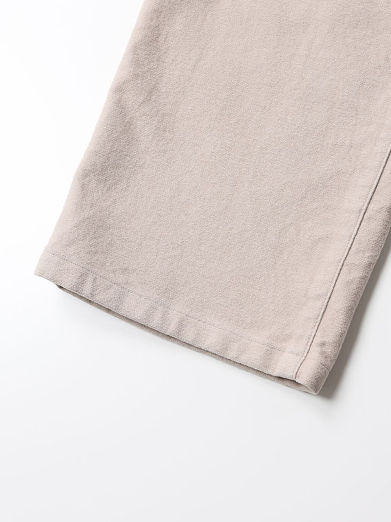 その生地にサーバスⅡ加工(起毛+エアーワッシャー)を施してウォーム感とソフト感を出したアウター用素材です。しっかりとした厚みを持っていますが、ふんわりと柔らかく軽い、心地良い肌触りです。適度なストレッチ性もありますので、快適な着用感を味わうことが出来ます。