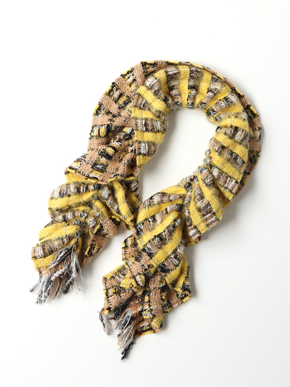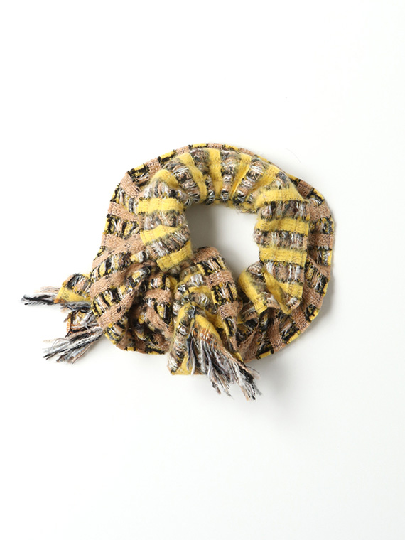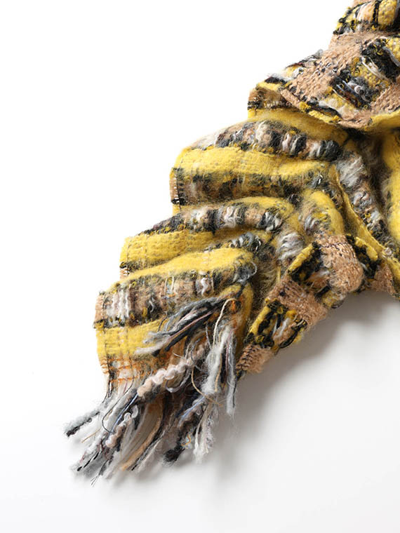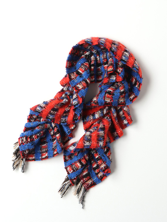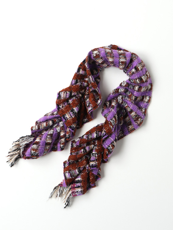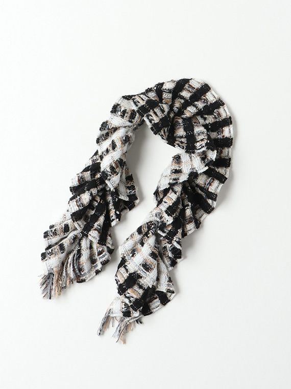 ふんわりしたループヤーンを使ってゆるく織り上げたチェック柄がお顔周りに華やかなアクセントを添えるアイテムです。