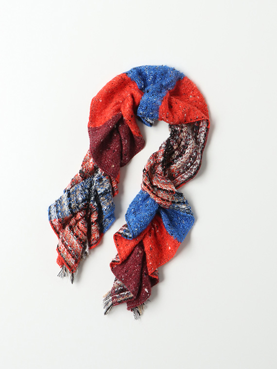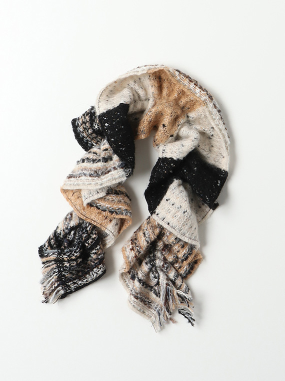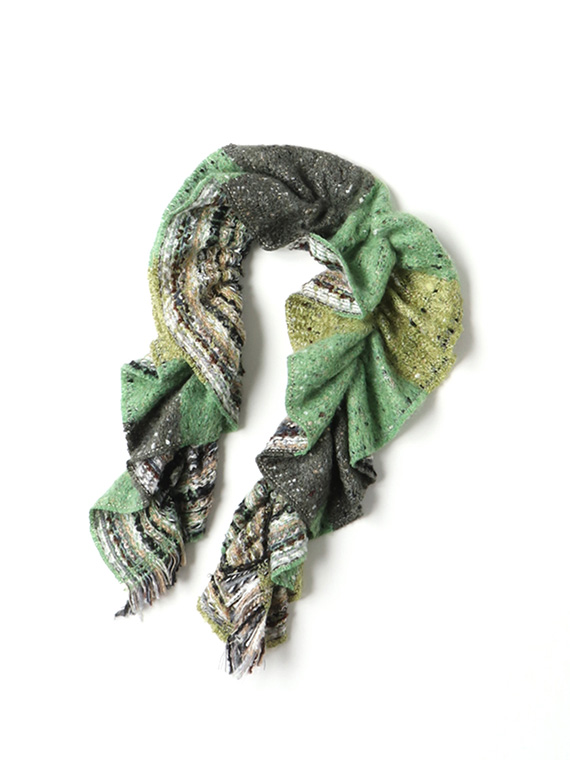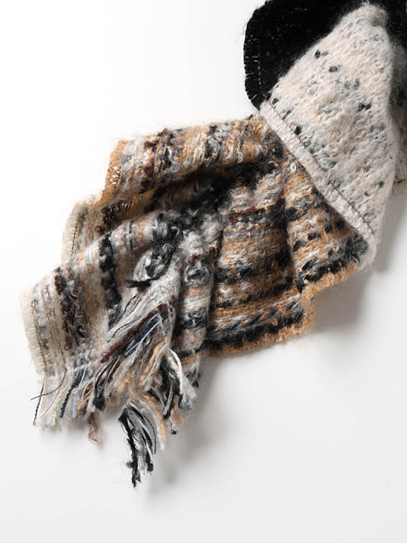 ループヤーンやラメ糸、太い糸から細い糸までさまざまな意匠糸でボーダーを織り上げ、全体として複雑で美しいカラーに仕上げ、お顔周りに華やかなアクセントを添えるアイテムです。