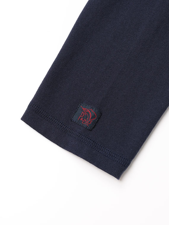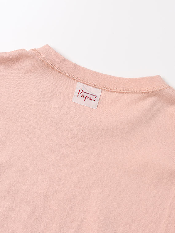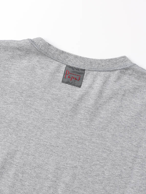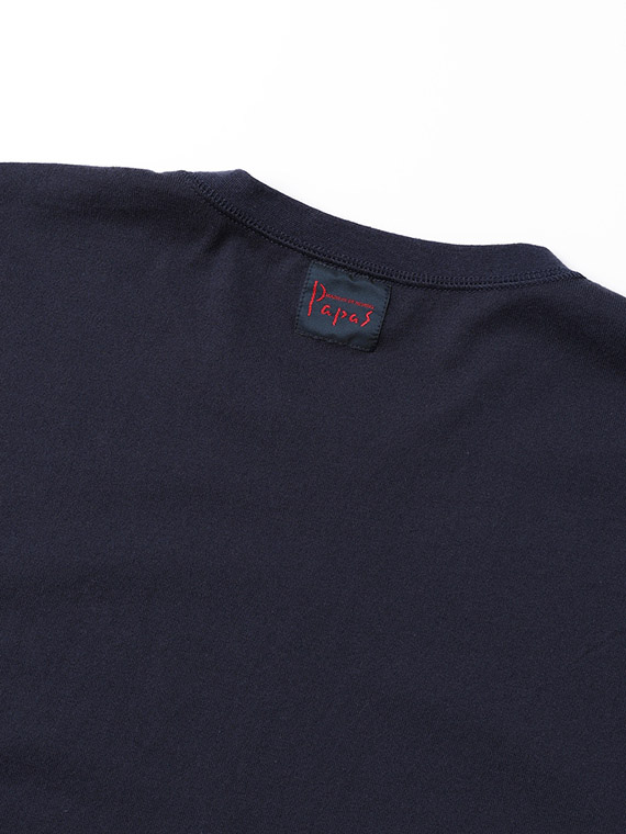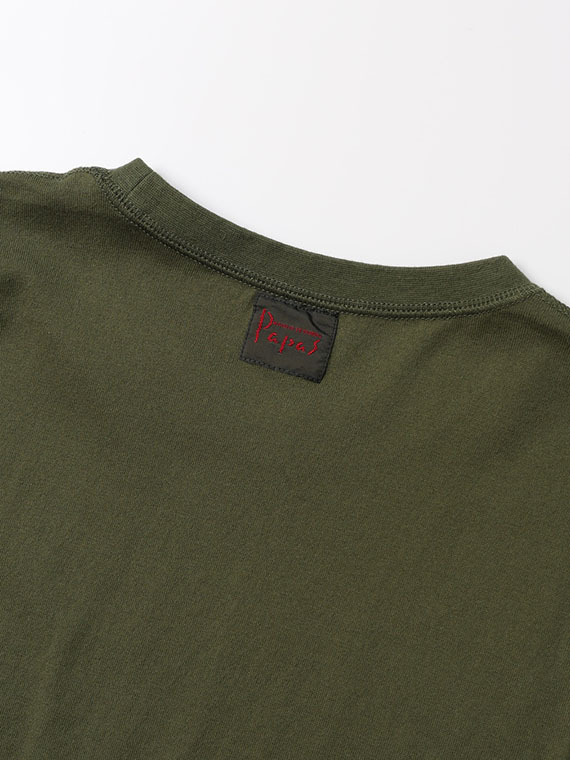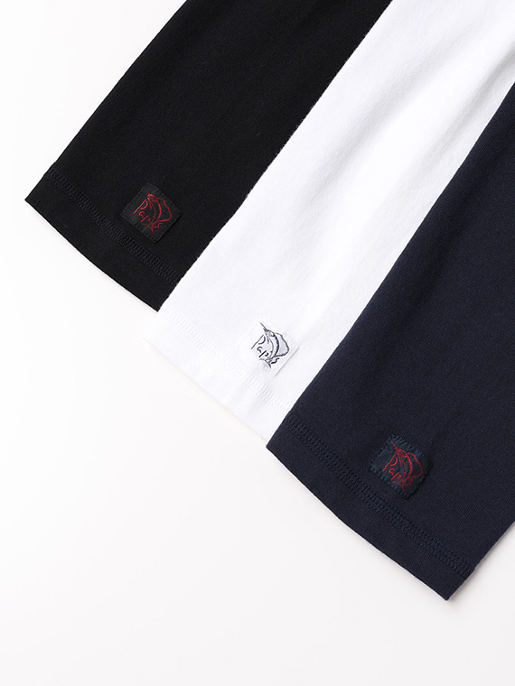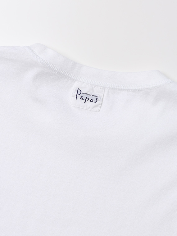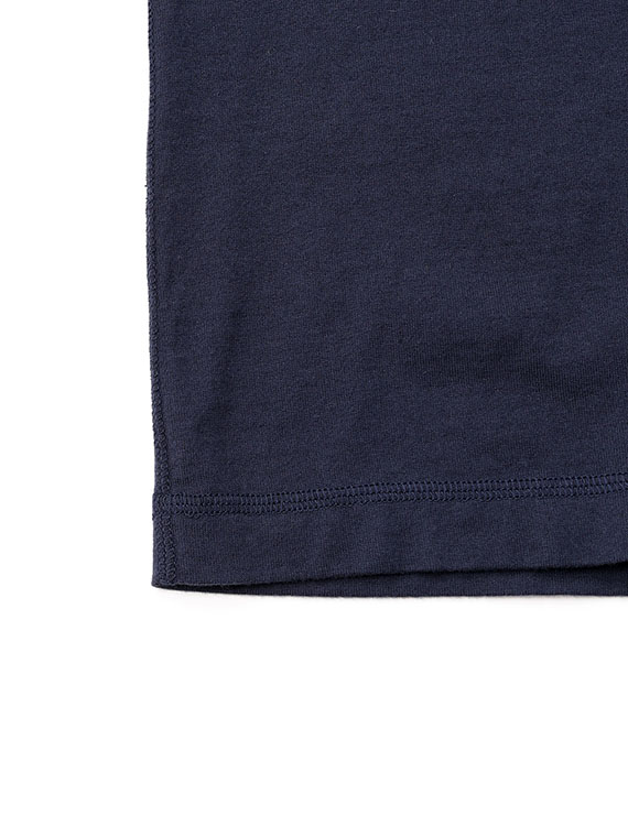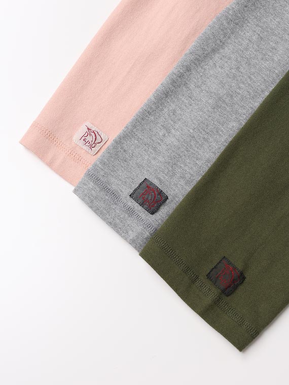 生地は、40番手のコットン糸を2本撚り合わせています。この40/2という製法により、1本の糸に十分な強度を持たせ、生地自体にしっかりとしたハリコシが生まれ、耐久性にも優れた生地に仕上がりました。透け感がほとんどなく、白でも安心して着用できる肉感も大きな特徴です。流行に左右されることなく、Tシャツの定番とも言えるベーシックな素材です。