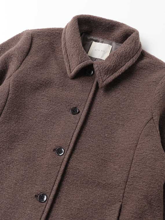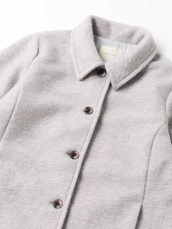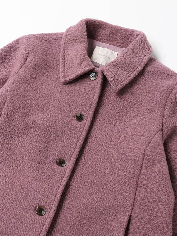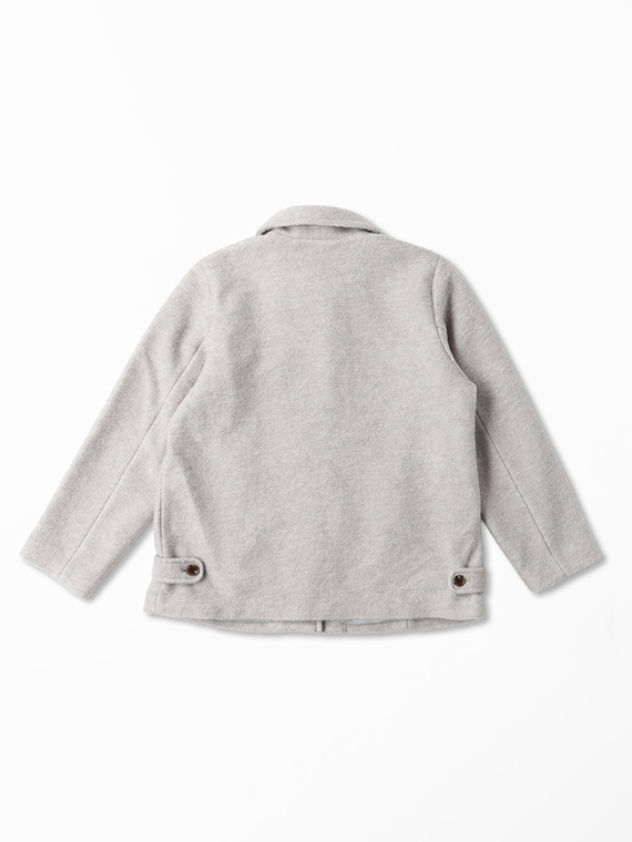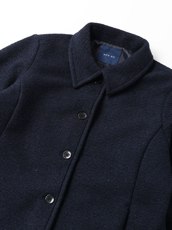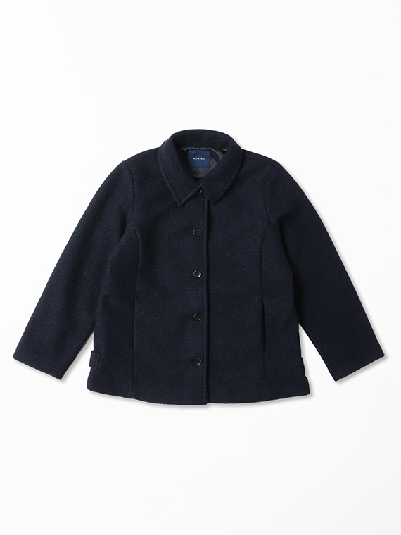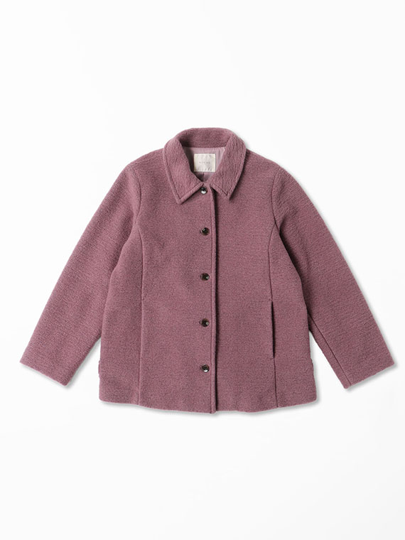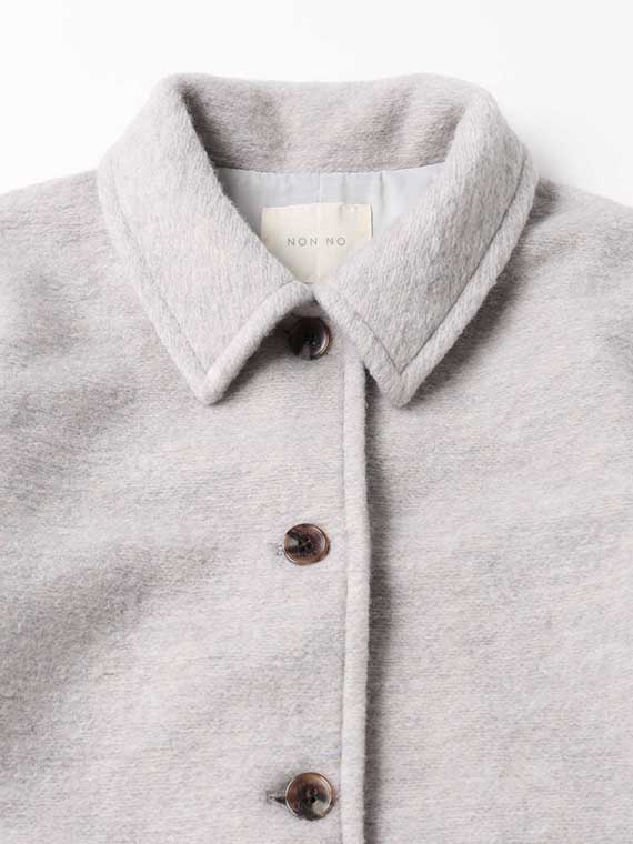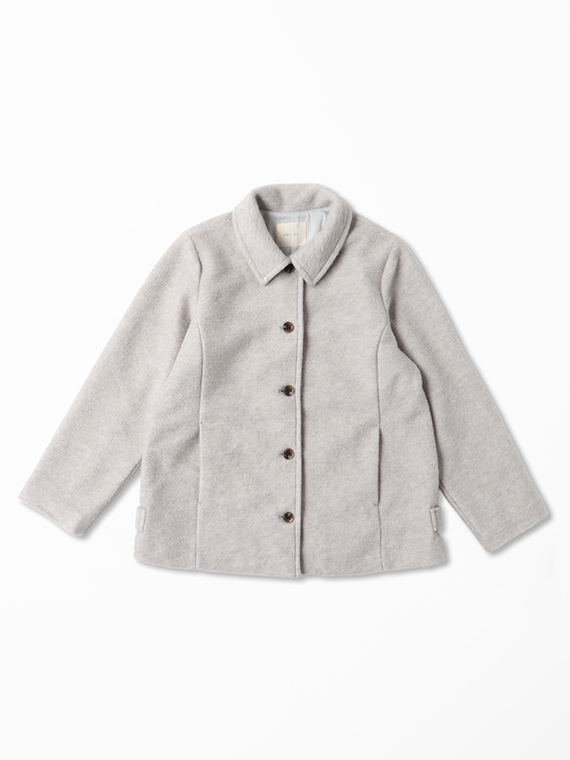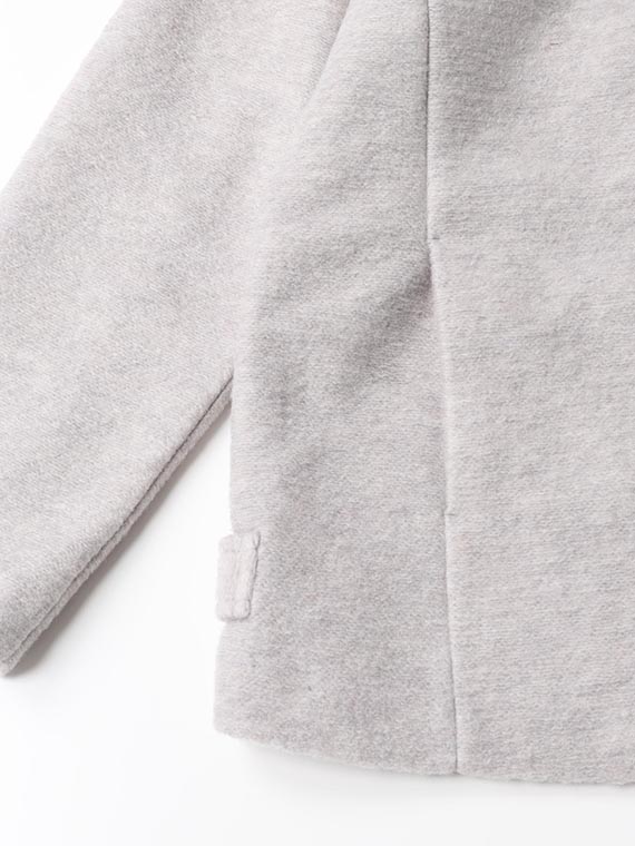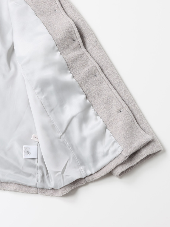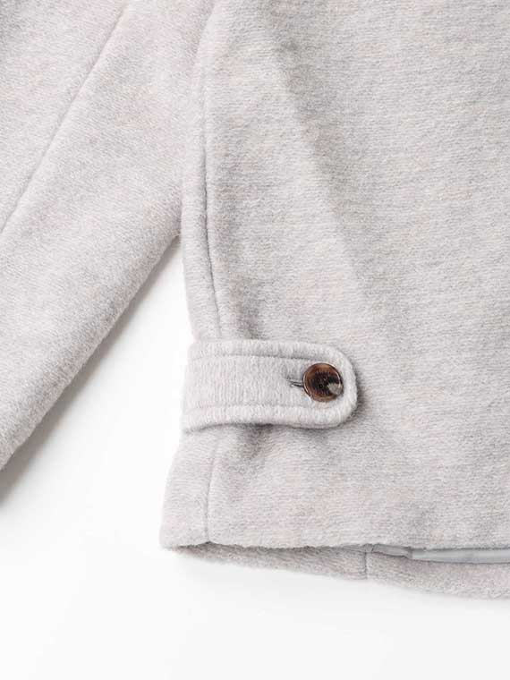 サイドの釦付きタブがディテールアクセントになっています。見た目よりとても軽い着心地のアウターです。同素材を使用したケープ風シルエットのブルゾンもございます。