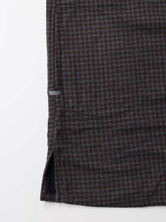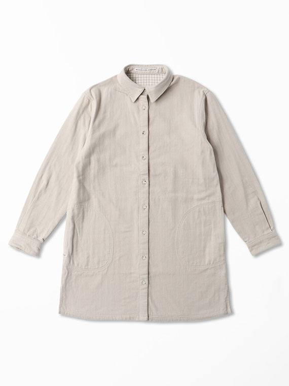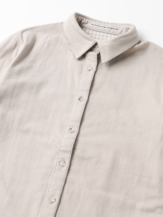 タテ糸・ヨコ糸共に30/2を使用することで平織ベースの二重織りです。全て30/2の糸を使用することで平織ベースながら存在感のある素材です。表無地と、裏のギンガムチェックの2枚の生地を接結二重織りでつなぎ合わせることで両面を楽しめます。仕上げの加工で両面に起毛を施すことで天然素材本来の柔らかく温かな風合いを表現しています。