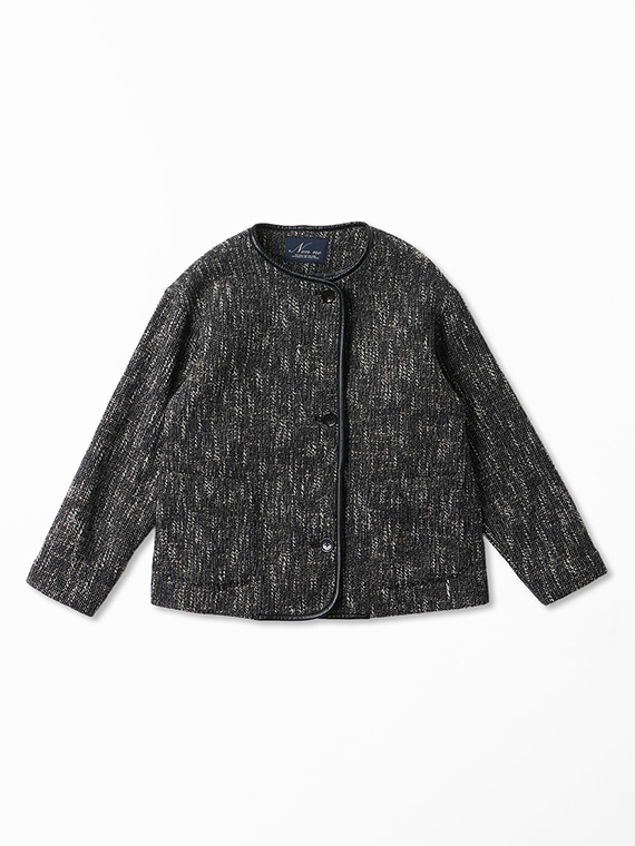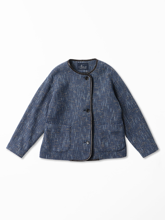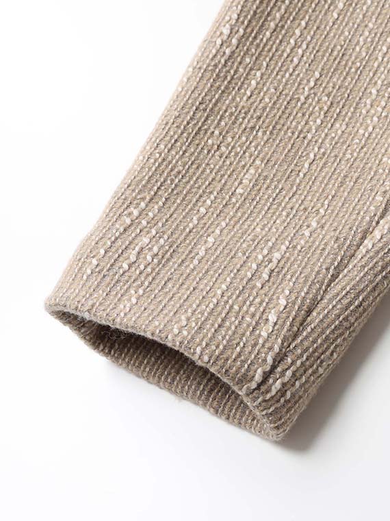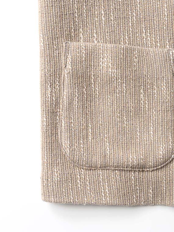 タテ、ヨコ糸共にSUPER140’Sウールにコットンスラブ糸を2本巻き付けた三つ撚り杢糸をベースにしたドビー組織ツイードです。ハイクオリティーなウールに動きのあるコットンスラブ糸を撚糸する事で特徴的なカラー表現となっています。織り組織にドビー織りを組合せる事で、よりやわらかで膨らみのある立体的な仕上がりのこの素材は、糸・撚り・織りと三位一体の拘りがつまったツィード素材です。