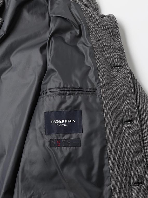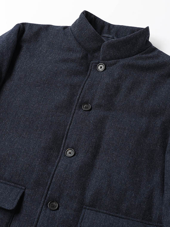タテ・ヨコ糸ともに1/34のウール/ナイロンの混紡糸を使用した軽量なフラノ素材のピンチェックです。ツイード感がありながらエアリアルな素材にするために紡毛糸の中でも非常に細番手の1/34を使用して織り上げました。1/34は細く軽い糸ですがナイロンを混紡する事で風合いと強度の両立を保ちました。ツイード感、ウォーム感がありながらエアリアルな特徴はこの糸質によるものです。非常に軽く、ソフトでウォーム感のある風合いに仕上がっているこの素材は、秋冬の素材として最適な素材と言えるでしょう。