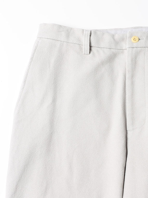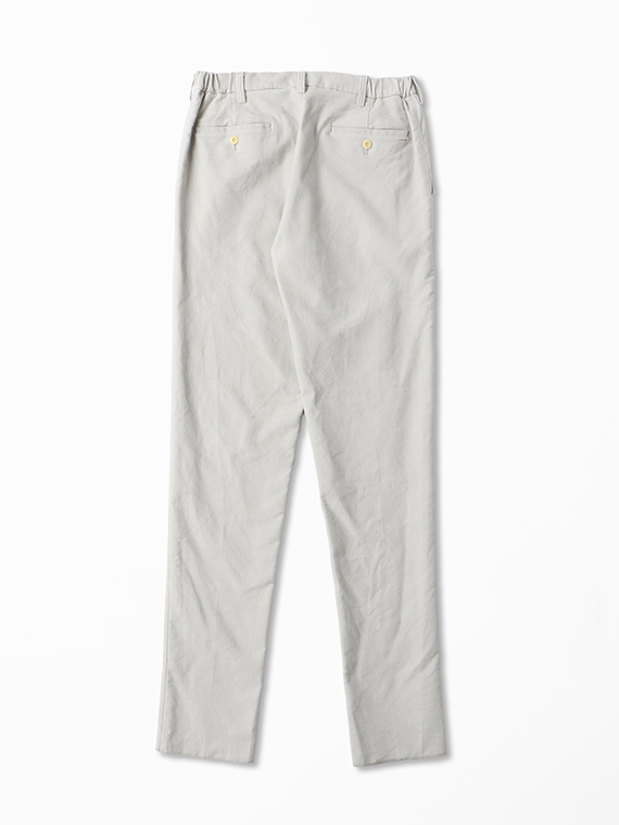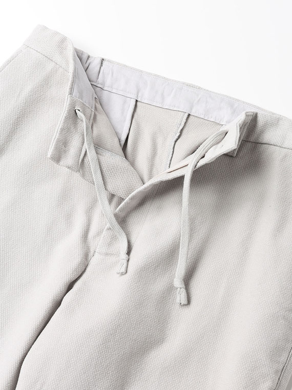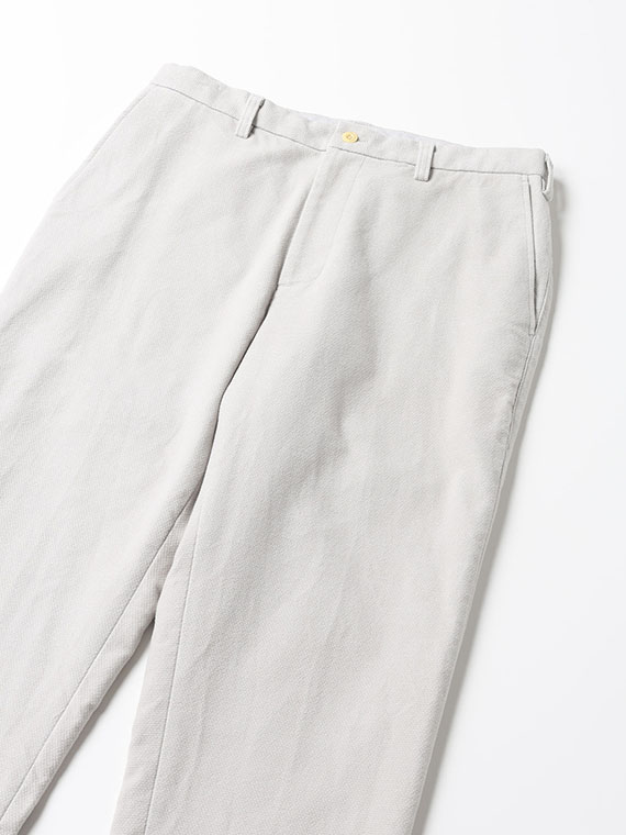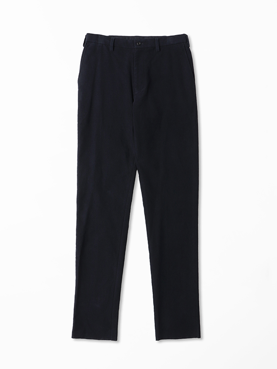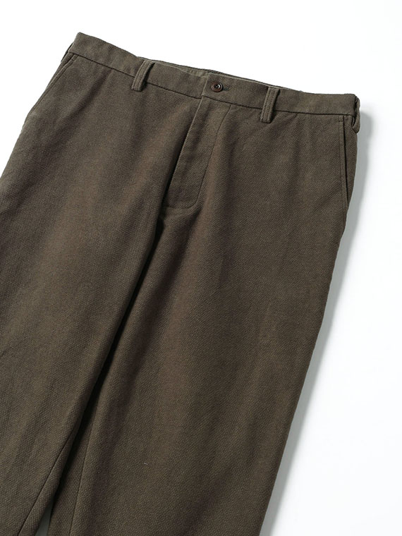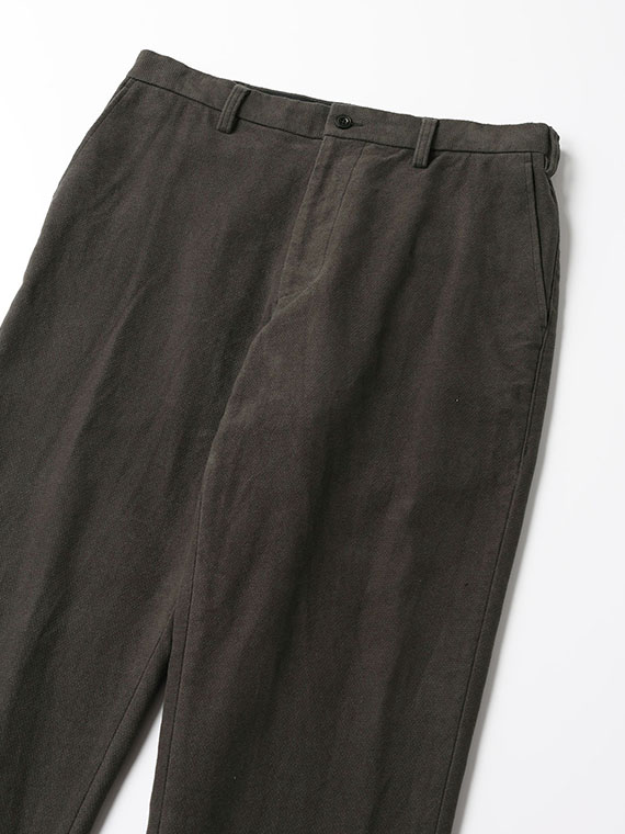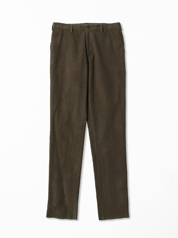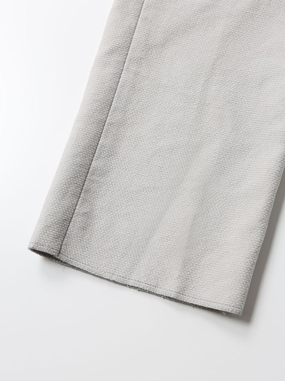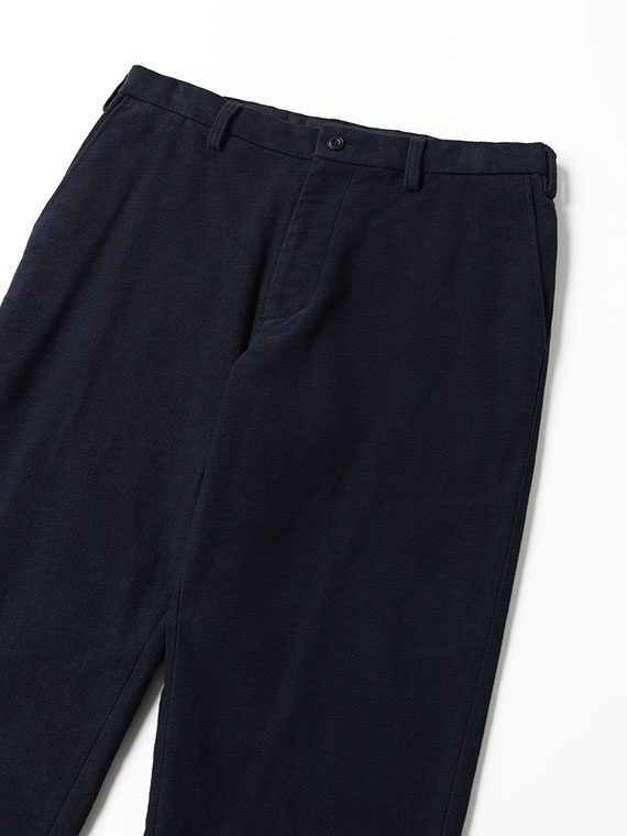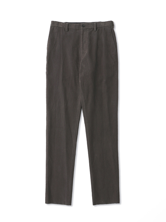タテ糸に16/1セミコーマ糸、ヨコ糸に16/2セミコーマ糸と40/1CSYを使用した高密度のドビー織りストレッチ素材です。ストレッチ性のある軽快な着心地感と、仕上加工にて表面にはサーバスⅡ加工(起毛+エアーワッシャー)を、裏面には針布起毛を施したソフトで膨らみのある肌触りとウォーム感を感じられるこの素材は、秋冬のパンツ素材として最適な素材と言えるでしょう。