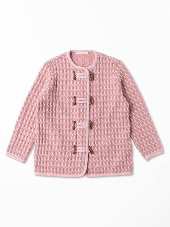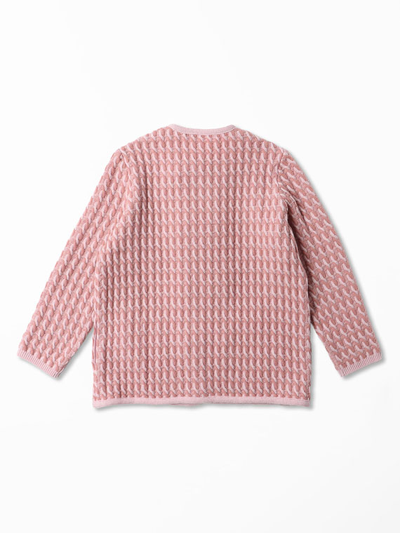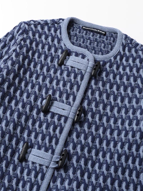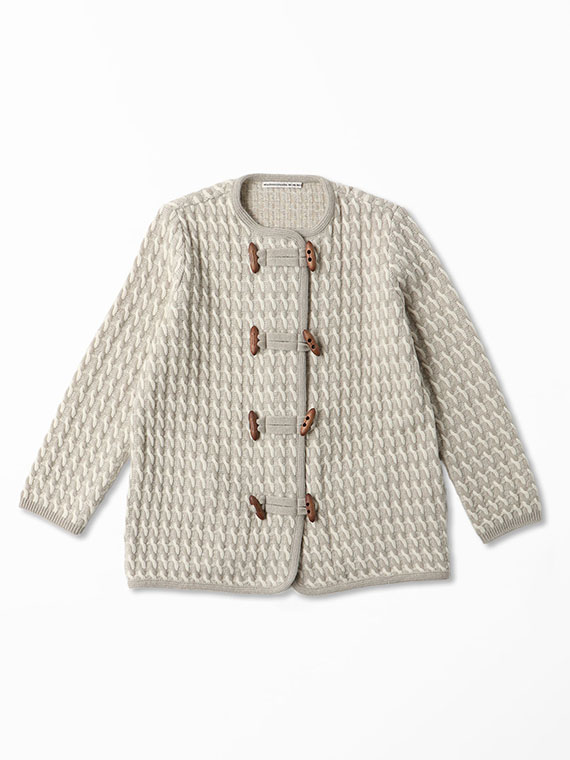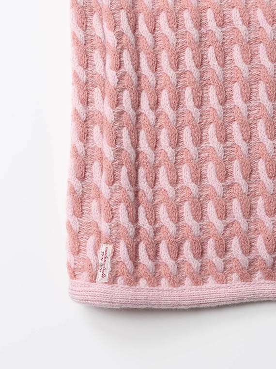 19μエクストラファインメリノウールを使用しています。エクストラファインメリノとは、3000種類以上も存在する羊の種類の中でも繊細な糸を生み出す事ができるメリノ種の羊毛です。一般的な羊の毛は20〜24μですが、メリノ種の中でも『エクストラファインメリノ』は18.5〜19.5μと細く繊細な糸です。綺麗な表面感と光沢、ソフトな風合い、天然繊維の吸湿性、放湿性も持ち合わせた上質な素材です。編みは通常のケーブルではなくJQ編みでケーブルを作成しているため、立体感があり見た目よりも軽いケーブル編みに仕上げています。