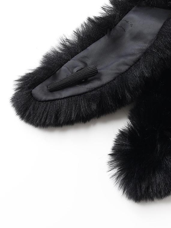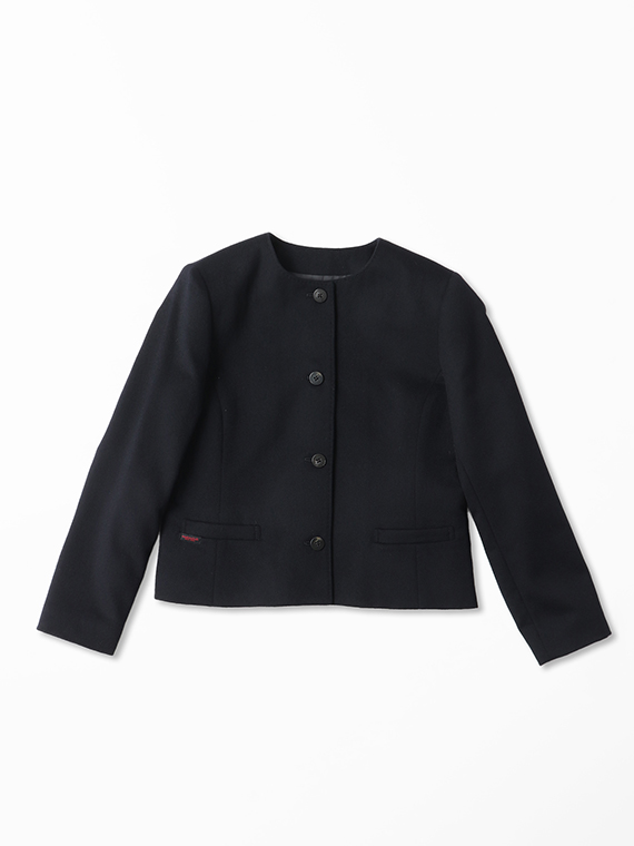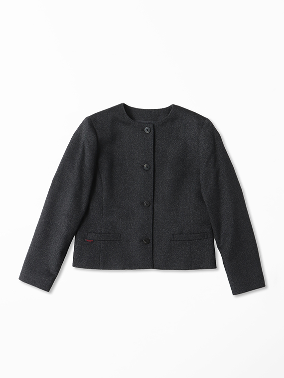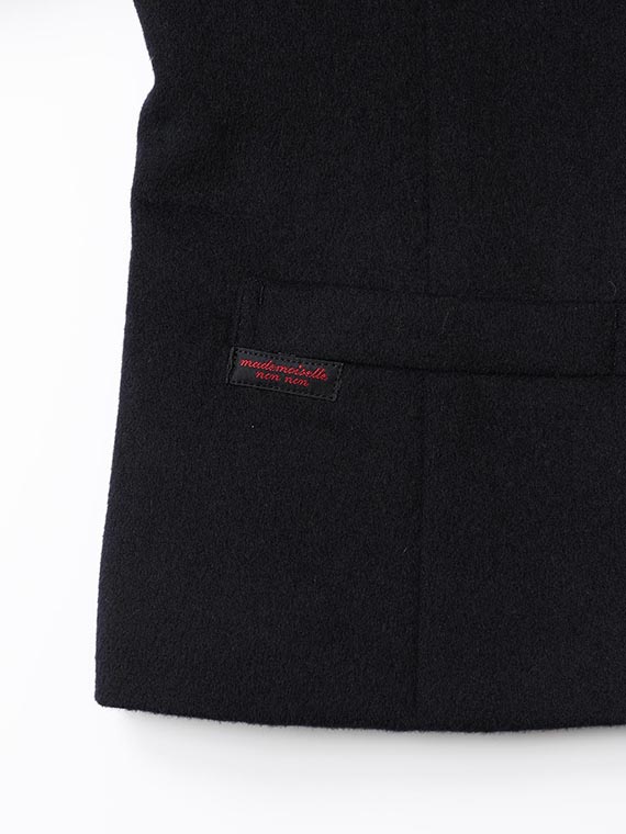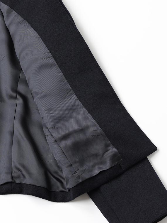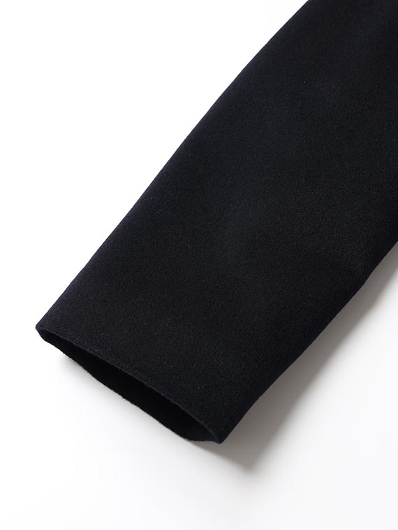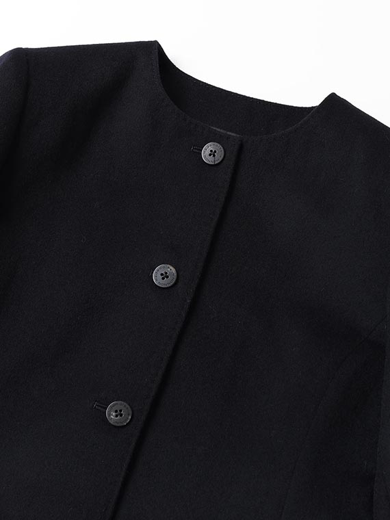 タテ糸・ヨコ糸共に最上級の1/15カシミヤを使用しています。組織は2/1綾で、この組織は肉感をしっかりと保ちながら薄く仕上げることが可能です。仕上げのビーバー加工はカシミヤの自然な光沢を最大限に演出出来る上質なカシミヤに最適な加工方法です。こちらの素材でノーカラーのショートジャケットを作成し、附属としてエコファーの付け衿も付けました。マフラータイプなのでその他のアイテムとも組み合わせが可能です。