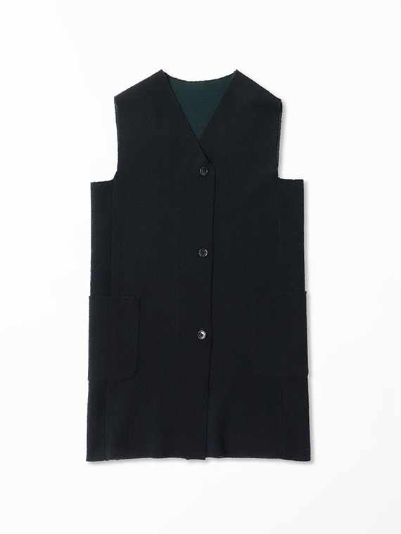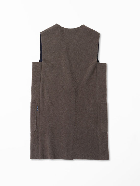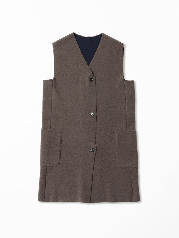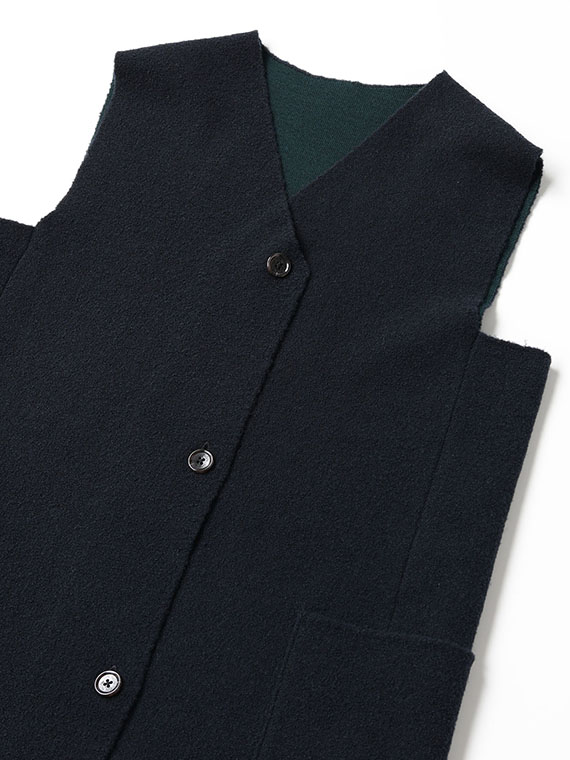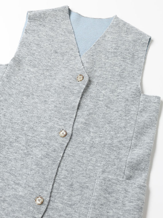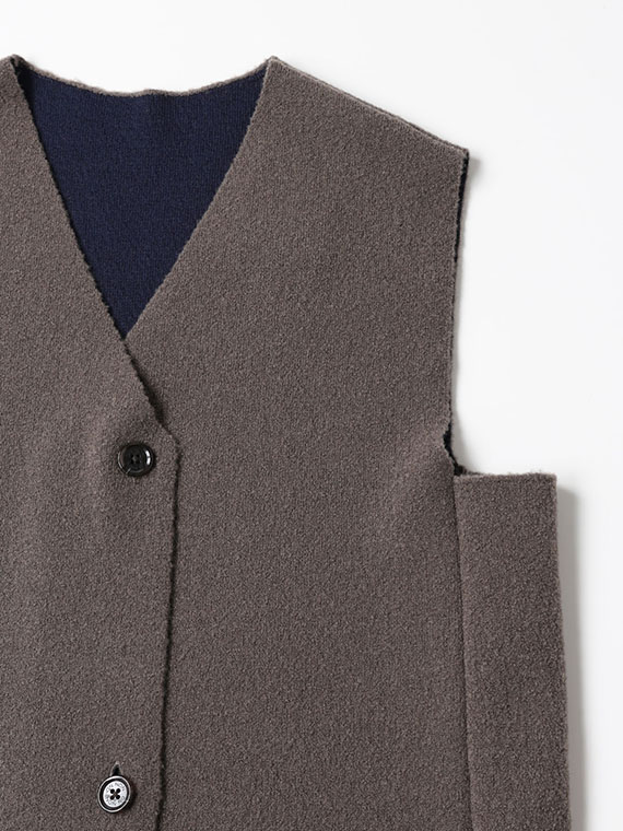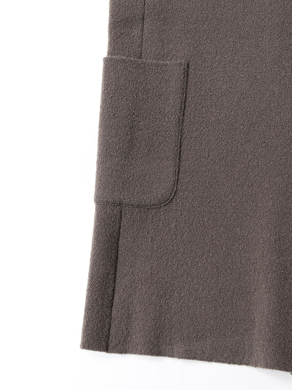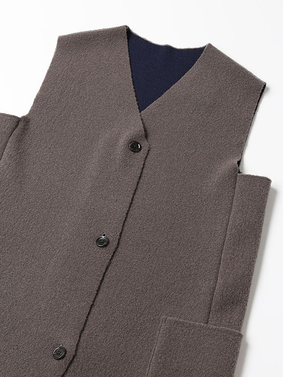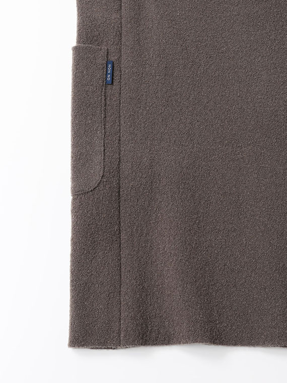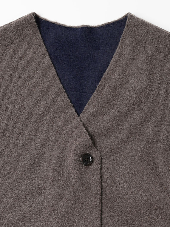 表側にはエクストラファインメリノウールとリサイクルナイロンを使用した表情豊かで軽量なブークレ糸を使用しています。裏側には異種糸を使用したWフェイス企画です。表側はブークレー糸の天竺、裏側はツヤがありピリングしにくいウールアクリル糸を使用してサラリと軽く仕上げています。