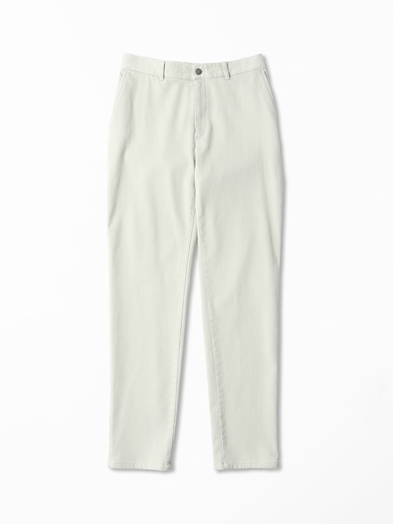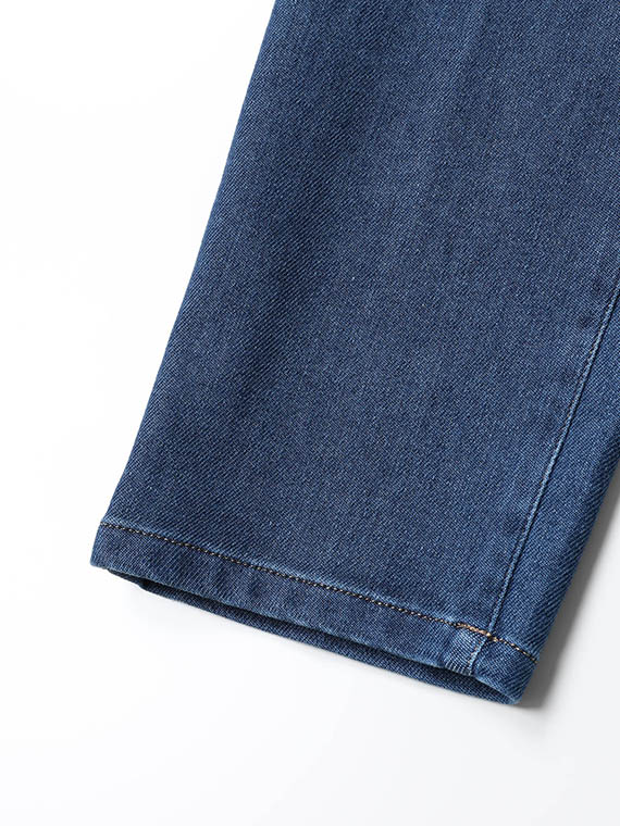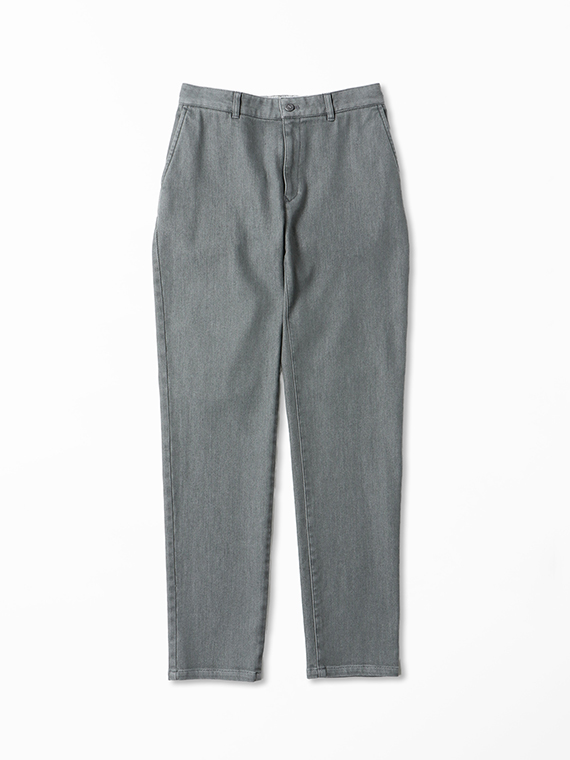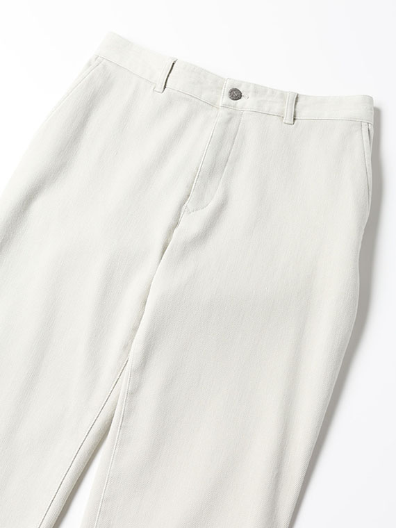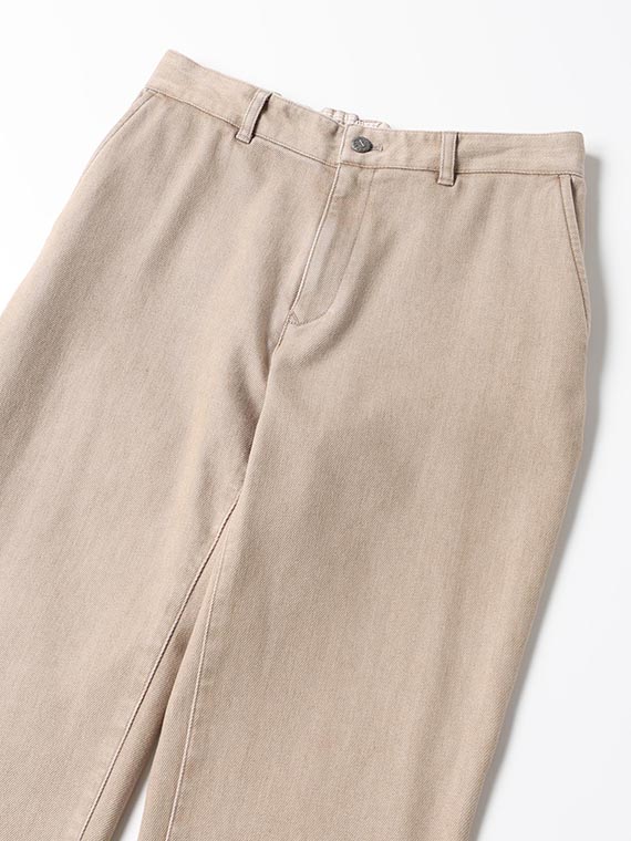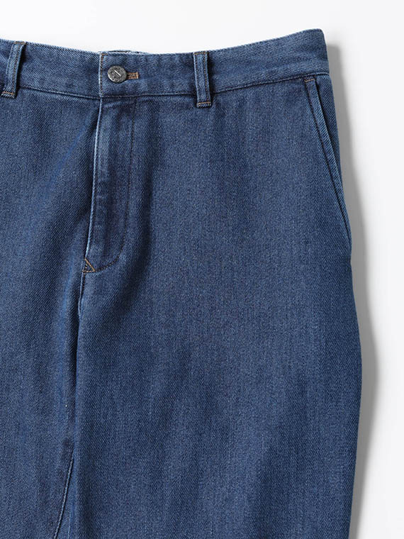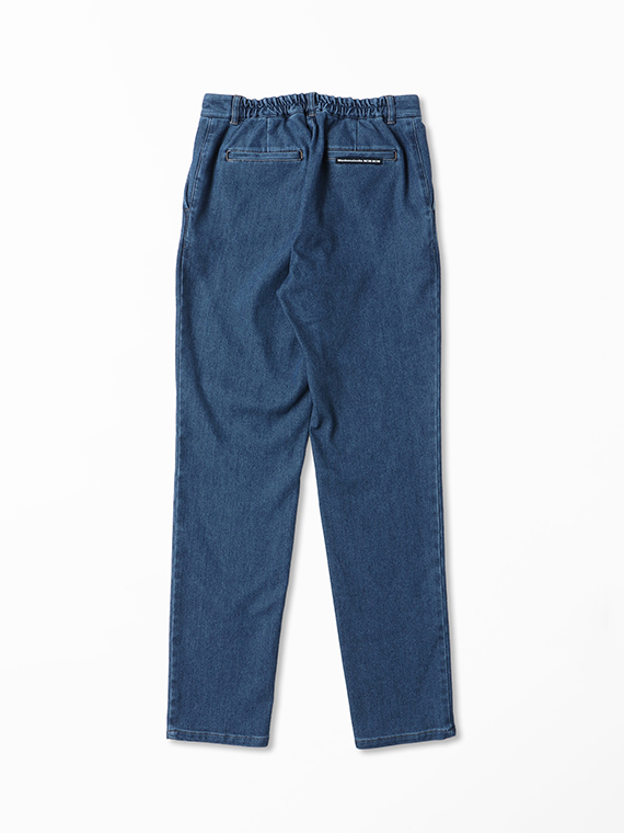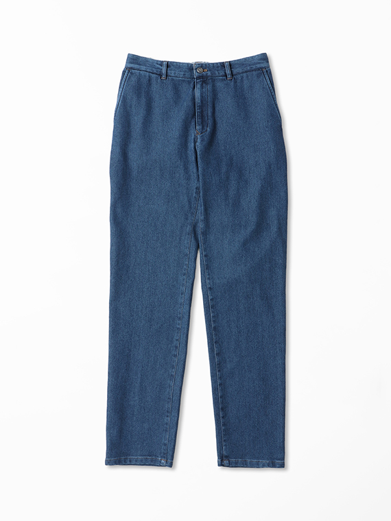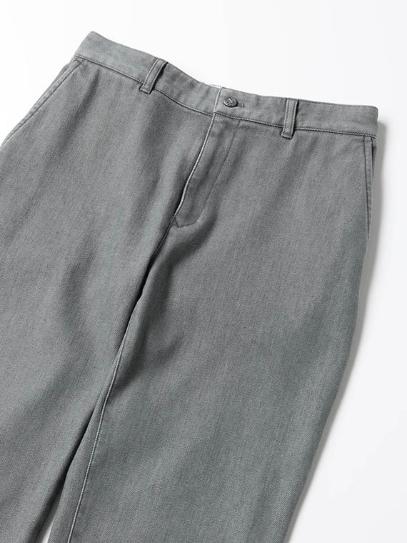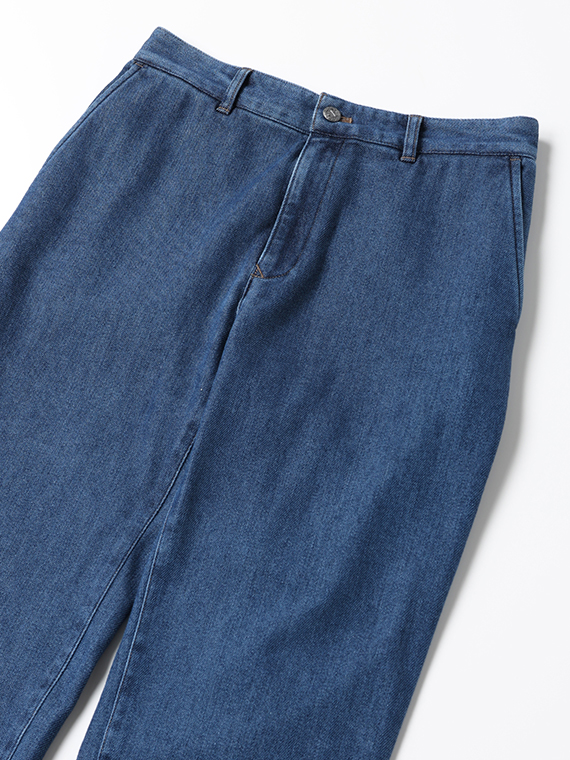 織りを工夫することによってデニムのルックスと、スウェットのような柔らかい履き心地の両方を楽しめる素材に仕上げています。また、ヨコ糸には厳選されたレーヨンを使用し、最終整理加工で生地を起毛させることで更に肌触りの良いデニムに仕上がっています。