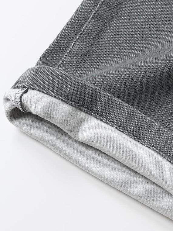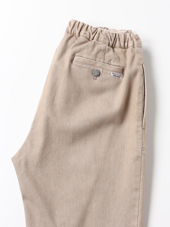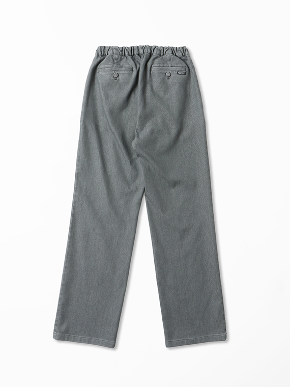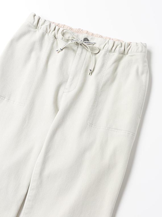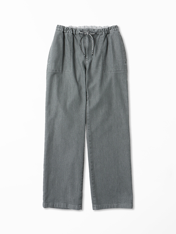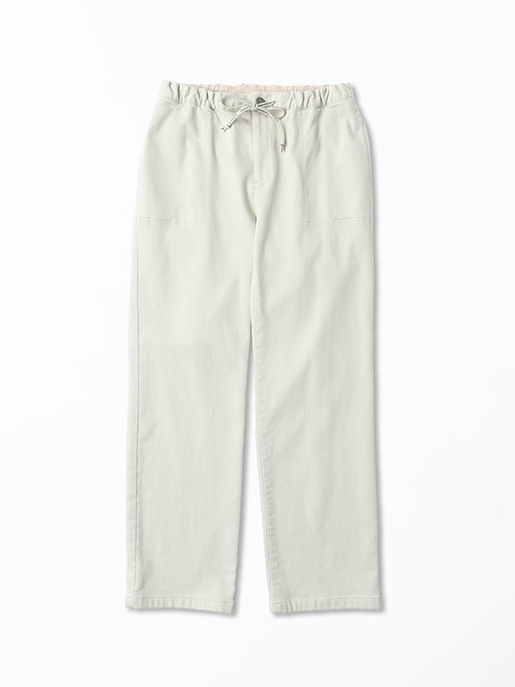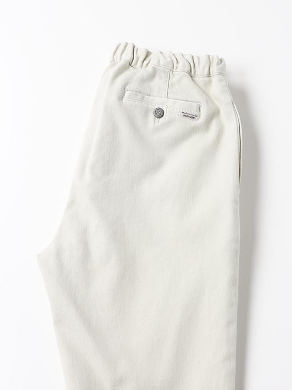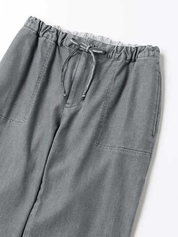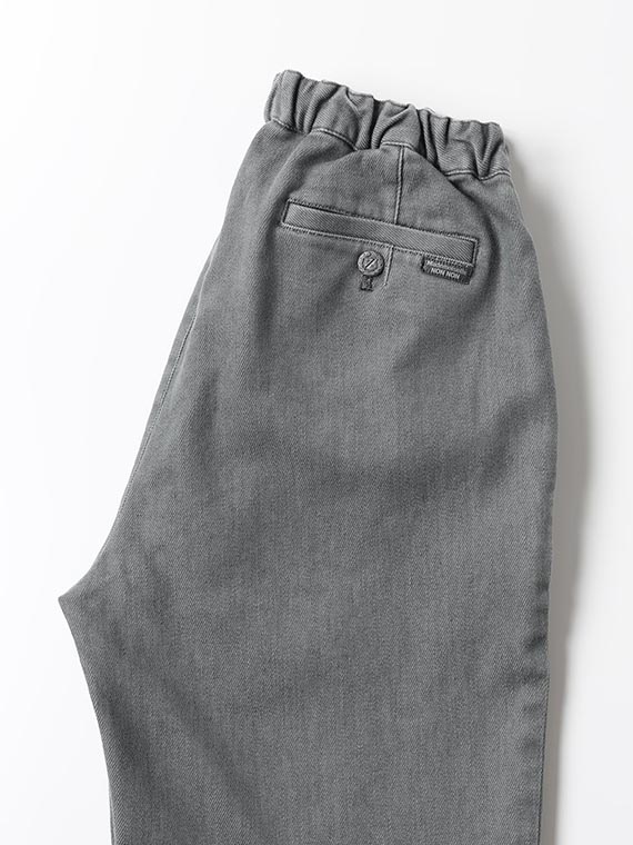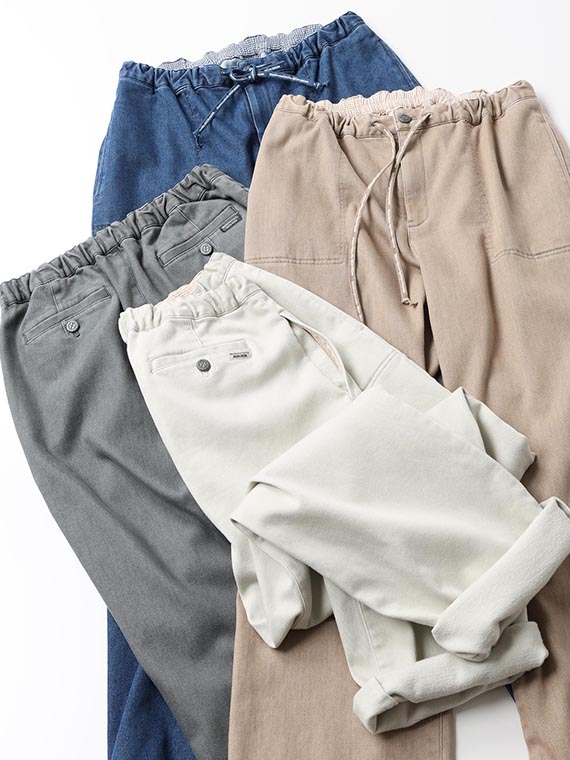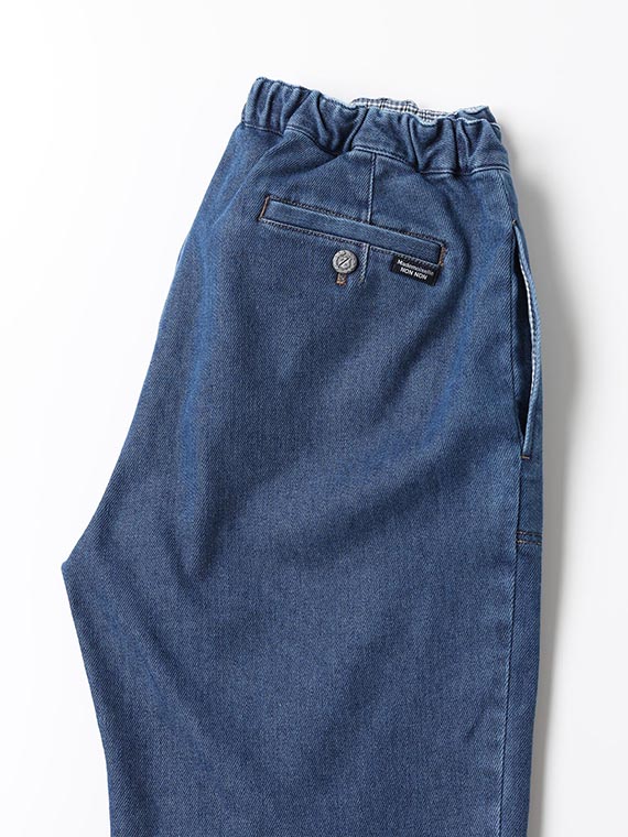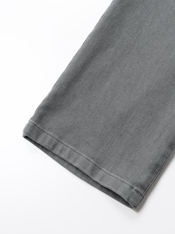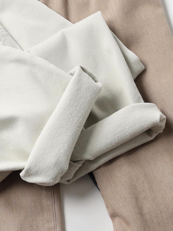 織りを工夫することによってデニムのルックスと、スウェットのような柔らかい履き心地の両方を楽しめる素材に仕上げています。また、ヨコ糸には厳選されたレーヨンを使用し、最終整理加工で生地を起毛させることで更に肌触りの良いデニムに仕上がっています。