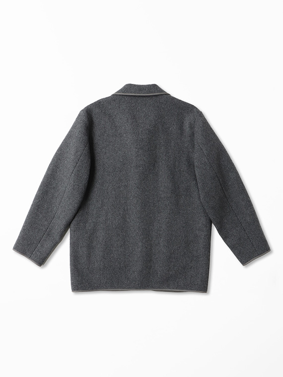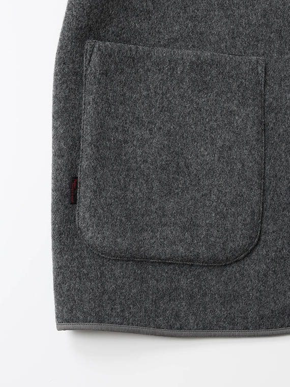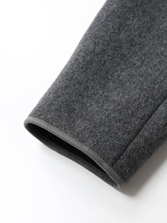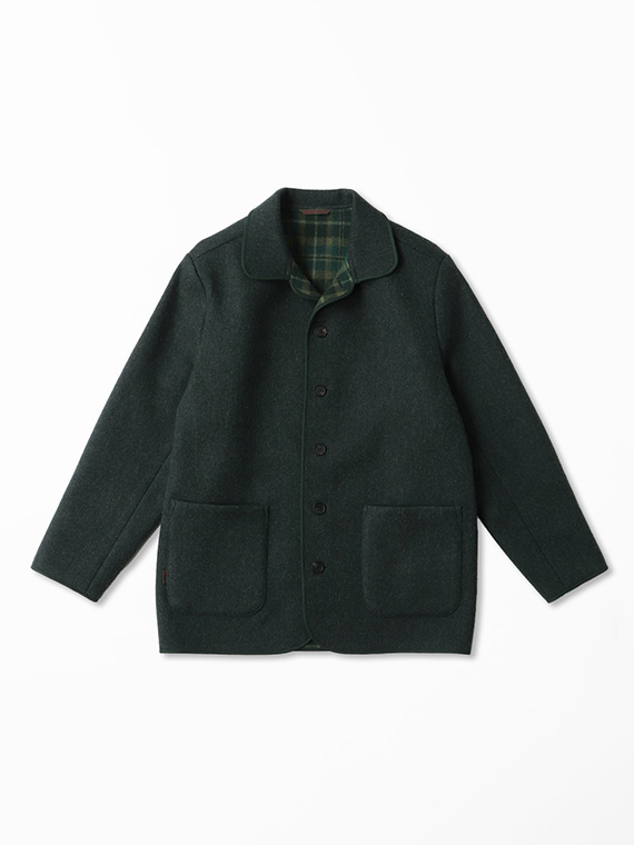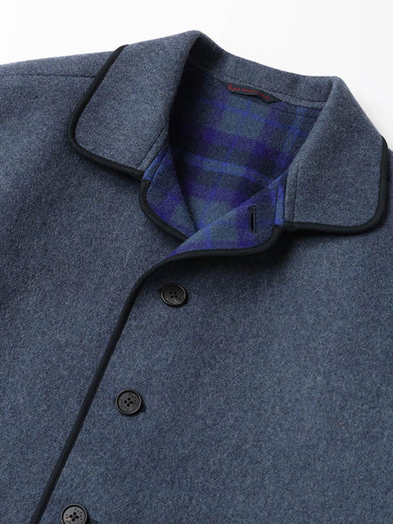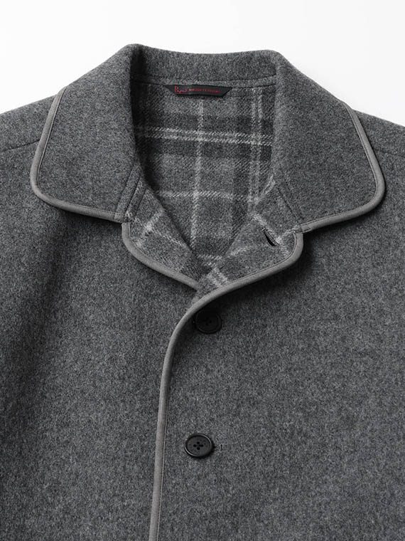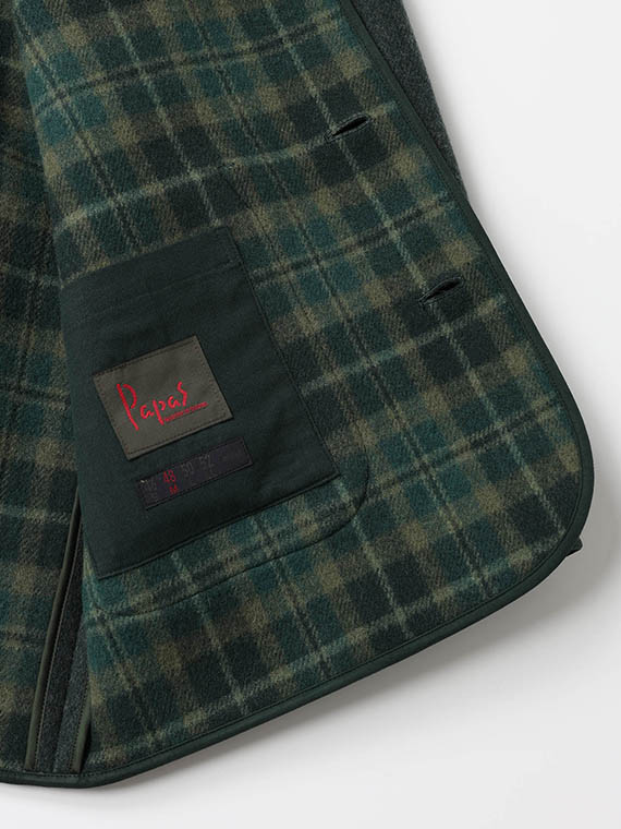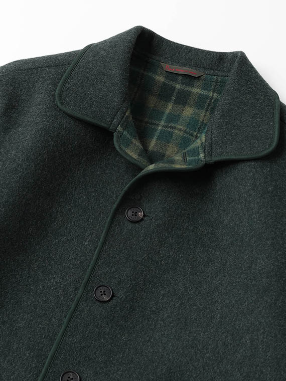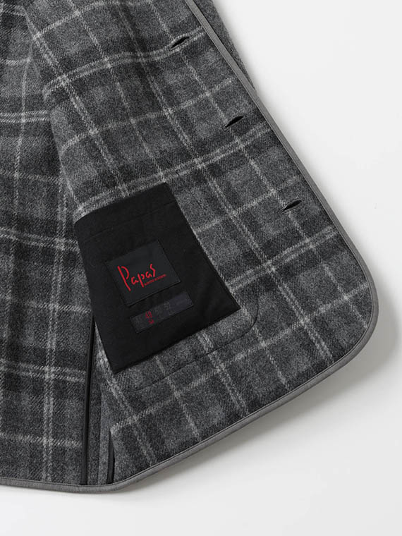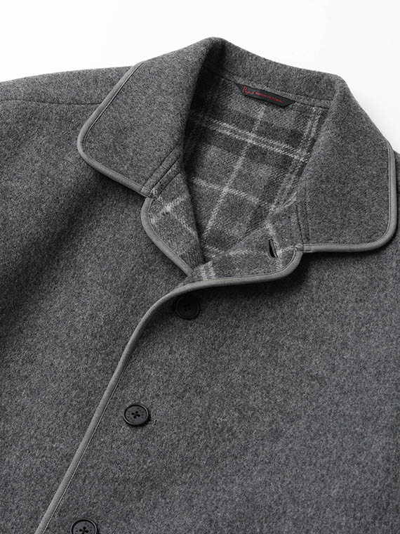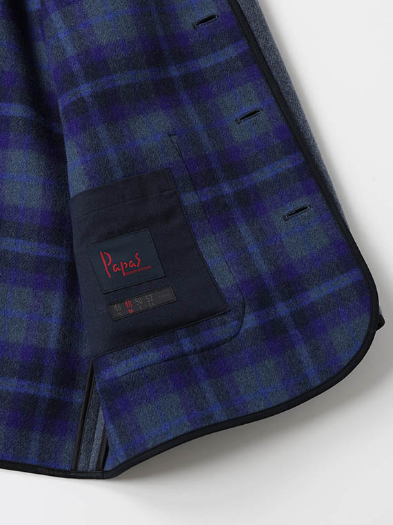 生地は、タテ・ヨコ共に1/14紡毛糸を使用した接結二重の素材です。2枚の生地を接結糸で織合わせ無地面とチェック面を構成しています。その後冬物ウール素材の特徴でもある縮絨加工を施しています。表裏それぞれの生地が縮絨されるので弾力性があり保温性にも優れた仕上がりになります。TOP糸を要所で組み合わせることで立体感のある奥深い発色になります。両面に起毛加工も施して有りますので肌触り良い手触りです。