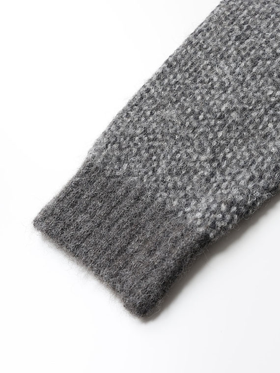 アルパカの中でもより繊細で滑らかさに優れたベビーアルパカを使用してブークレ糸にしています。ブークレのループは空気を多く含む構造になっている為、とても軽く、アルパカ独自の滑らかで膨らみのある風合いに仕上がります。