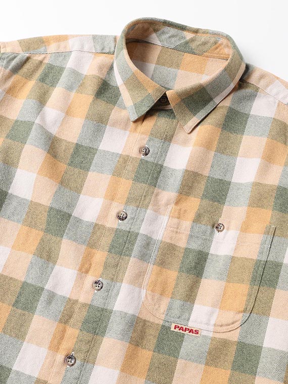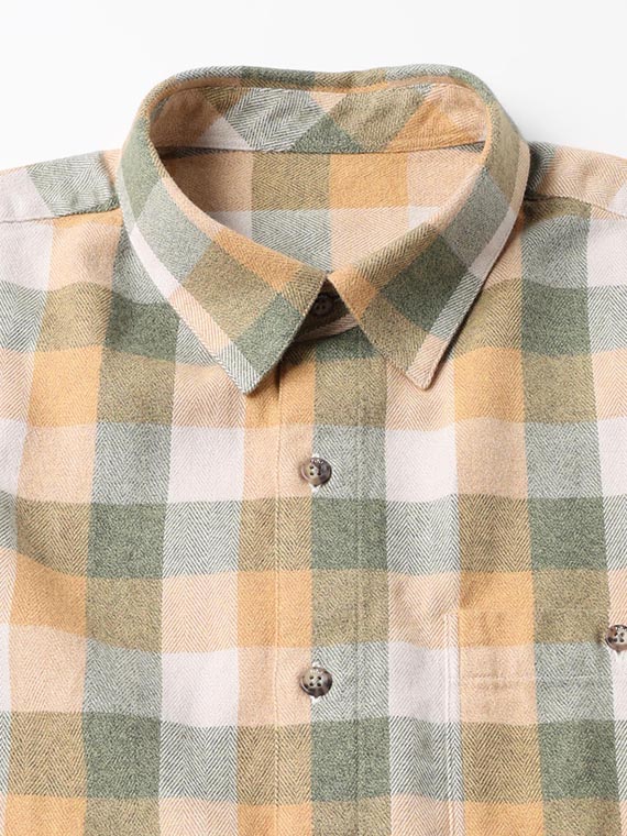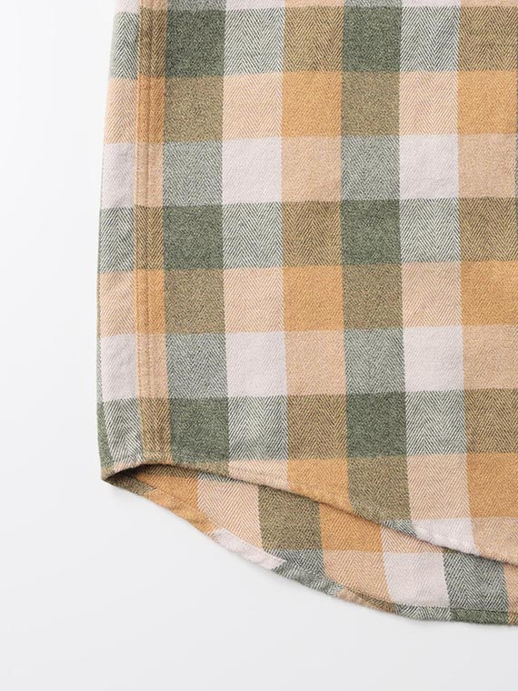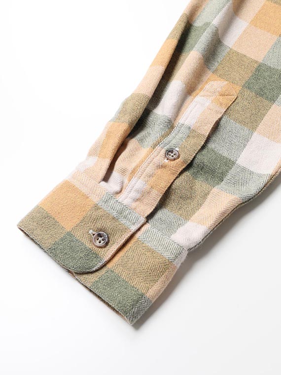タテ・ヨコ共に30/2綿糸を使用したヘリンボン組織の素材です。各カラーを30/1で一度染色しその後双糸に撚り合わす事でカラー杢が作られます。2色使いの杢糸とブロックチェック柄とヘリンボン組織との組み合わせによる融合で9組のカラーを一度に表現できた特徴的な柄表現です。多色な構成ながらトーンを考慮した繊細な発色も特徴です。仕上げ加工には両面に特殊起毛加工を施し、非常にソフトで膨らみのある風合いに仕上がります。