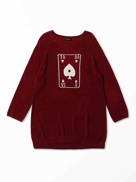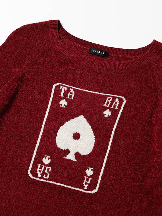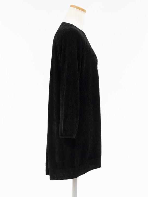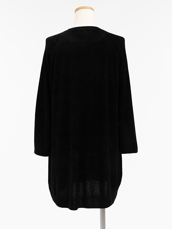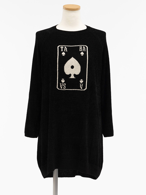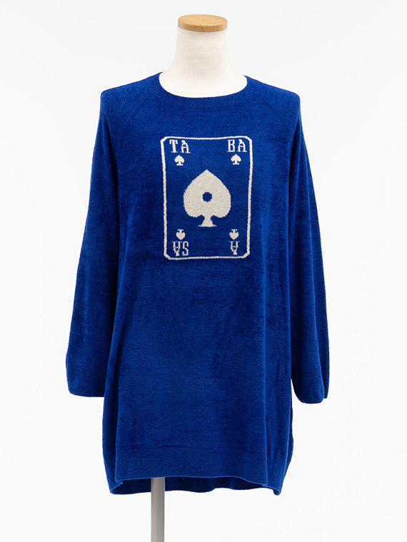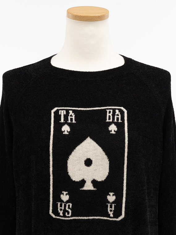 モール糸と呼ばれる毛羽のある糸で編んだ天竺素材でモチーフをインターシャで入れました。