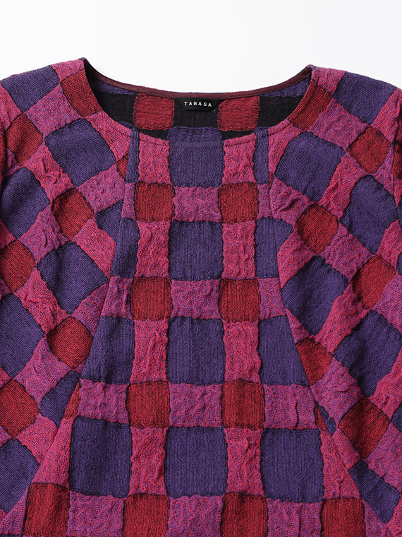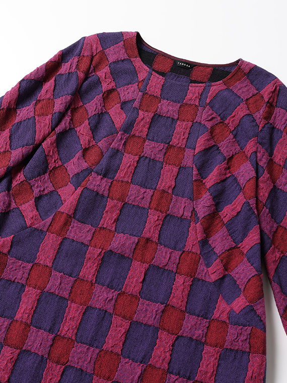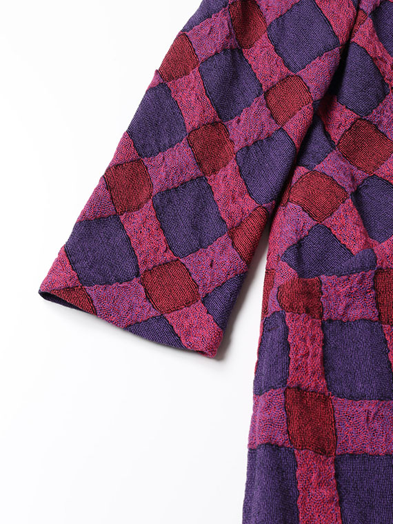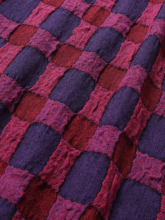 ブロックチェック柄は織りで表現されるため、プリントにはない奥行きのある陰影と高級感が生まれ、大人の女性にふさわしい洗練されたクラス感を演出します。また、適度な厚みとウールの弾力性によりシワになりにくいため、エレガントでありながら日常使いにも優れています。肌に触れる面はコットンが加わることで、柔らかく優しい肌触りです。