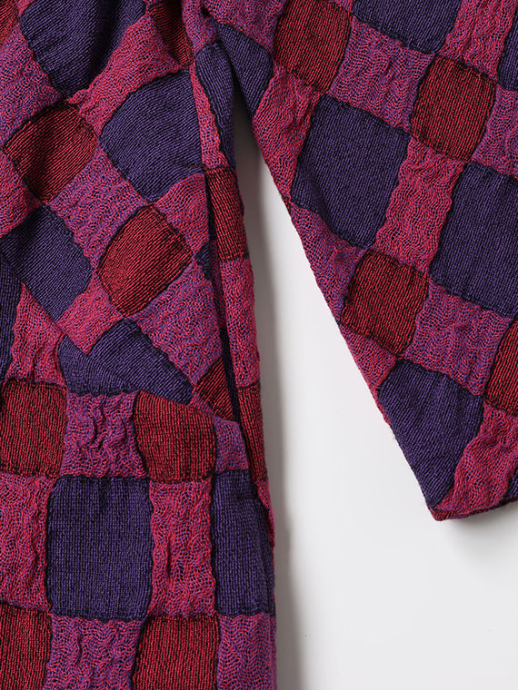 最大の特徴は、前身頃と袖のバイアス使いです。ダーツを生かした切替線でブロックチェックの柄の方向を変えることで、視覚的に『I』ラインを強調し、さらに身体を立体的に、ほっそりと見せます。