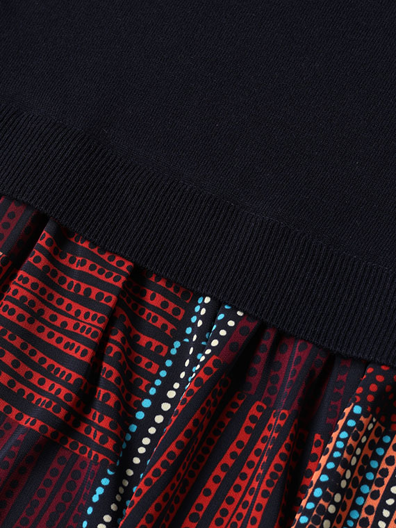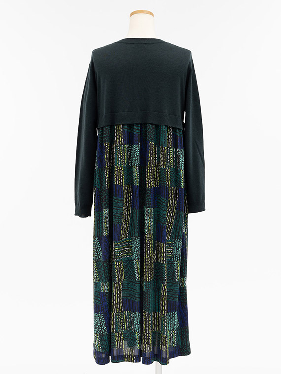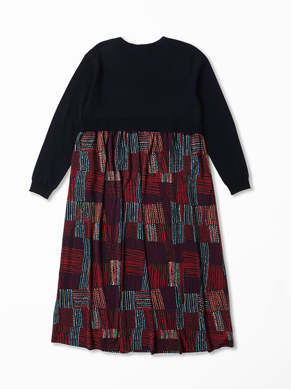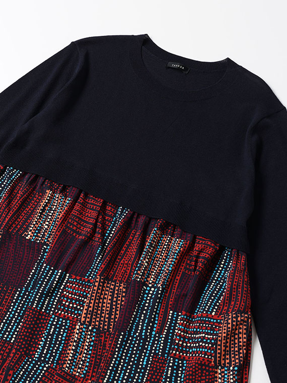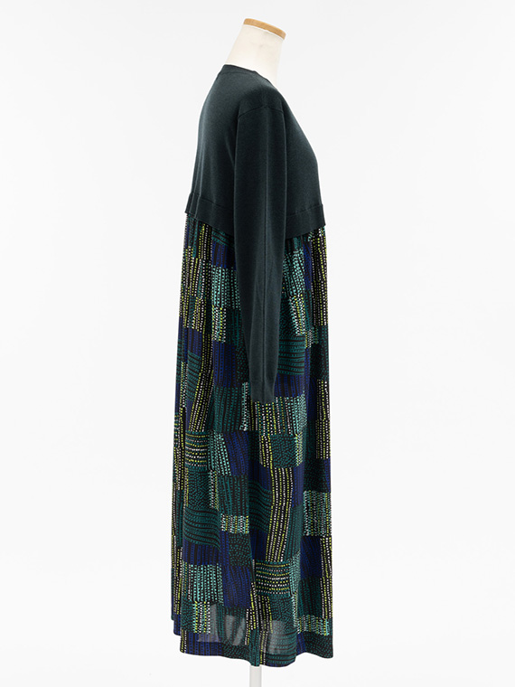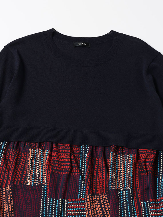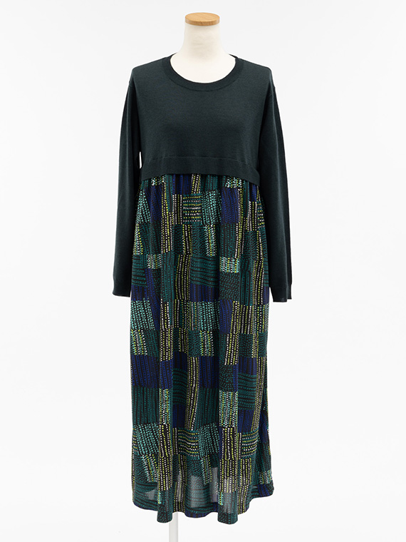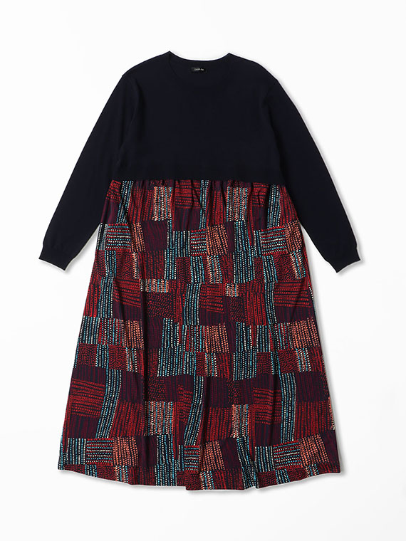 胸下までの短めのニットの上身頃は、ほど良く身体に沿いながらすっきりとした着心地で、そこから、軽やかなプリント生地のスカートがたっぷりと流れるように広がっています。