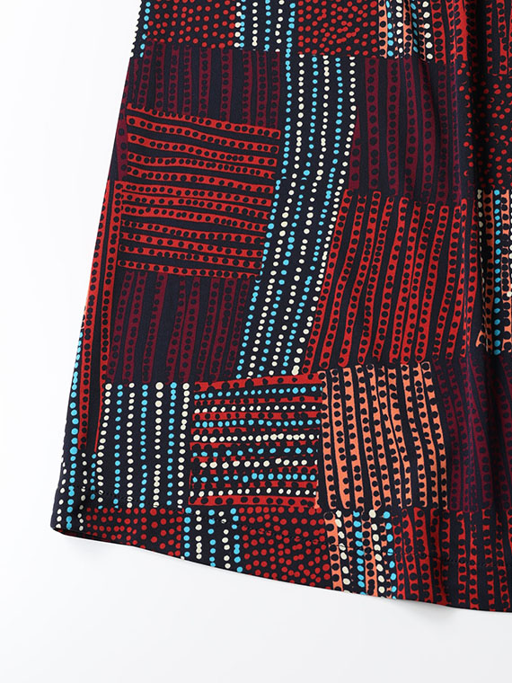 スカート部分→しなやかで上品な光沢感が魅力のポリエステル100%のスムース生地にグラフィカルにドット柄がプリントされた素材です。