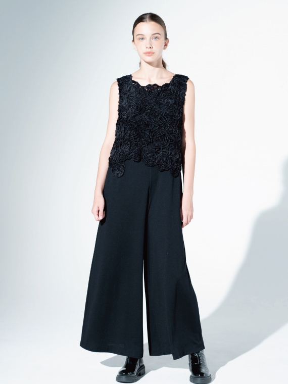 天然素材ならではの豊かな風合いと、ほどよい落ち感が魅力で、ワイドパンツのシルエットを美しく表現してくれます。