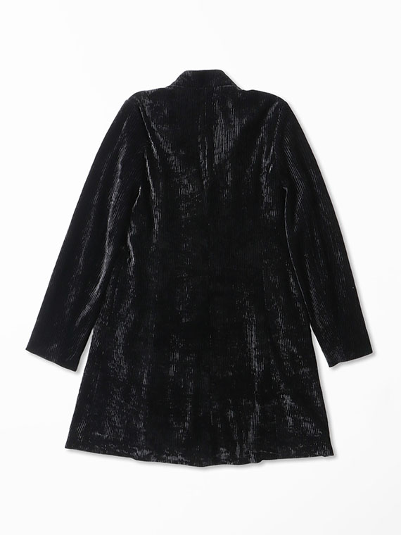 パイル糸を短くカットしたニットベロアに、ウェーブ状の型でエンボス(型押し)加工とクラッシュ(シワ)加工を施し、独特な陰影を表現した素材です。