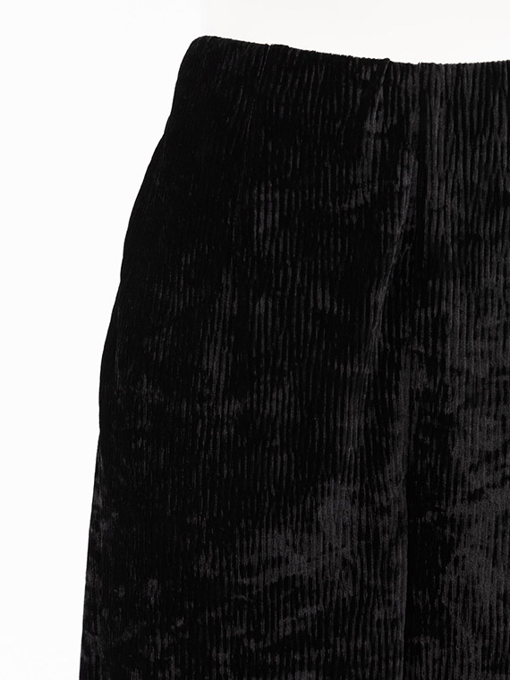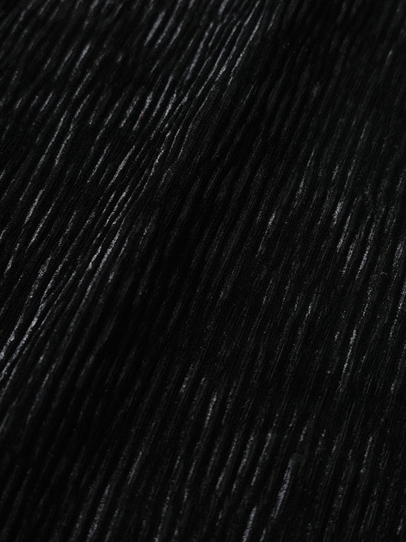 パイル糸を短くカットしたニットベロアに、ウェーブ状の型でエンボス(型押し)加工とクラッシュ(シワ)加工を施し、独特な陰影を表現した素材です。