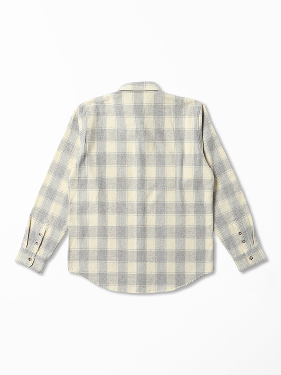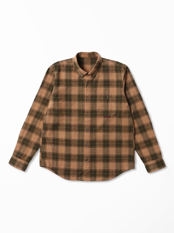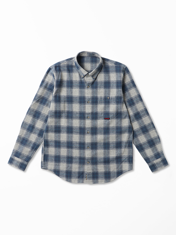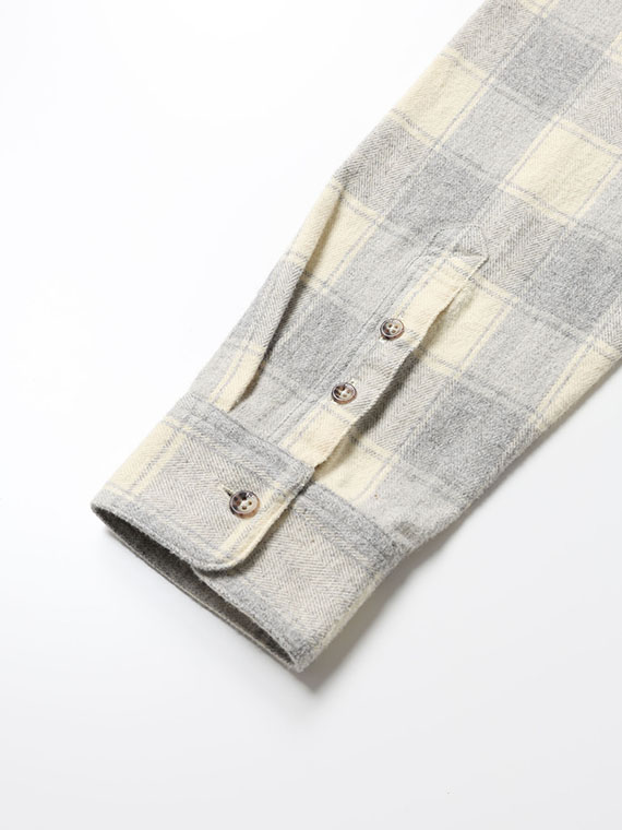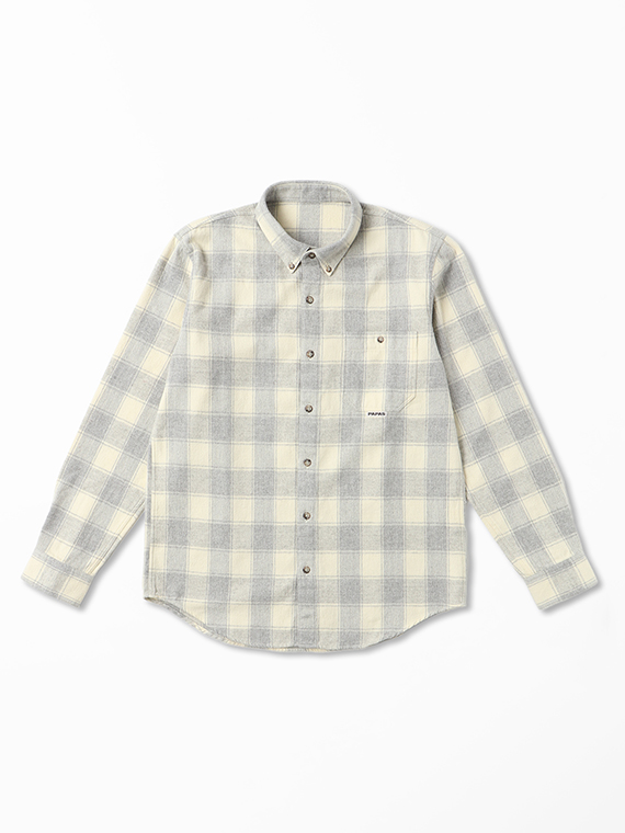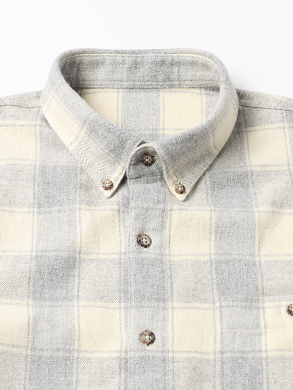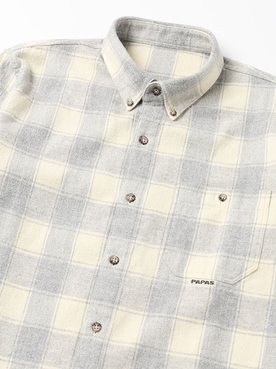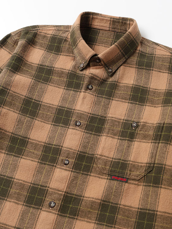 柄はヘリンボン組織でチェック柄に織った素材をさらに、生地の表面に起毛加工を施すことで、ぬくもり感と心地よい肌触りをより一層引き立たせています。素朴でありながら、手間をかけ原料にこだわった上質感。パパスならではのチェックネル素材です。