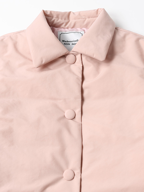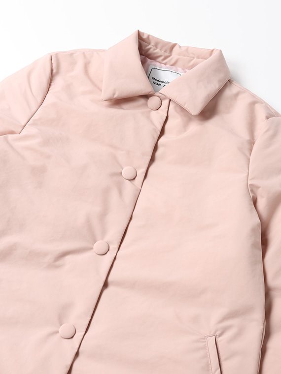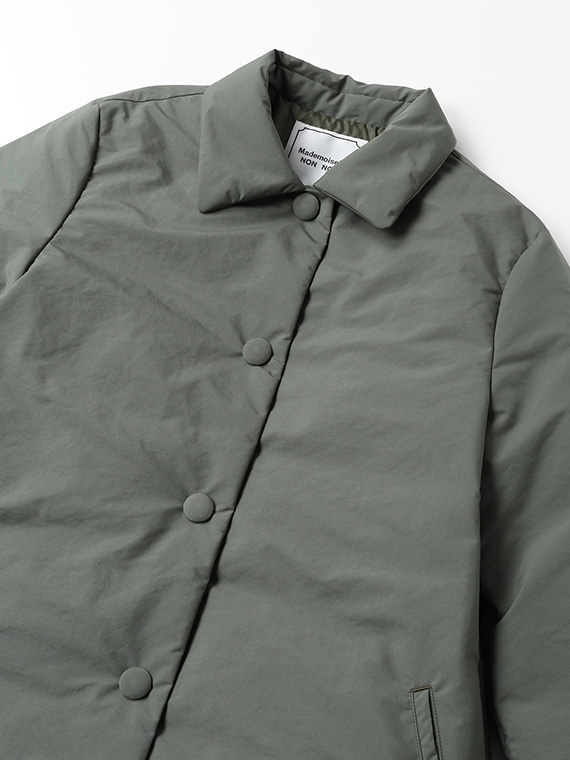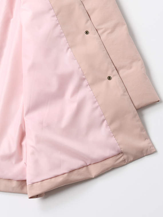 フロントは5つの共布くるみドット釦で、さりげない統一感をプラス。両腰には片玉縁ポケットを配し、シンプルながらも丁寧なディテールが光る一着です。
