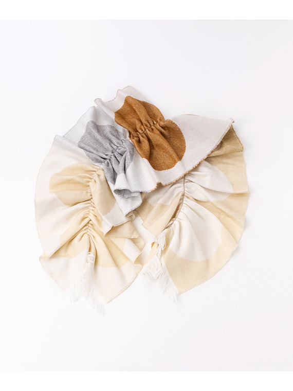 軽くてあたたかく、ふんわりとしたシャーリング加工が程よいボリューム感をプラス。シンプルな装いに添えるだけで、顔まわりを明るく見せてくれる一枚です。