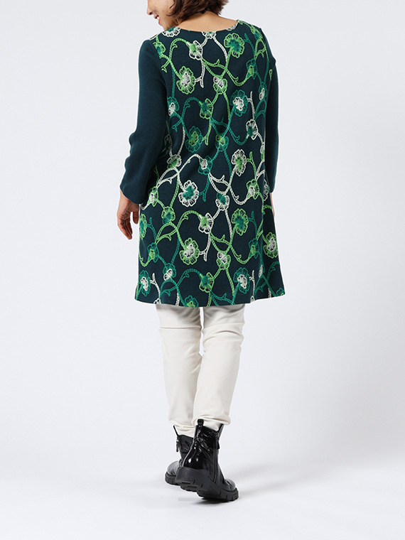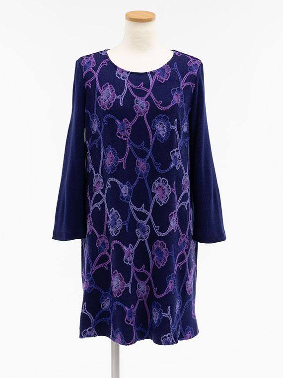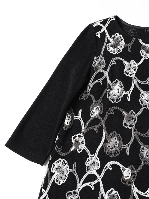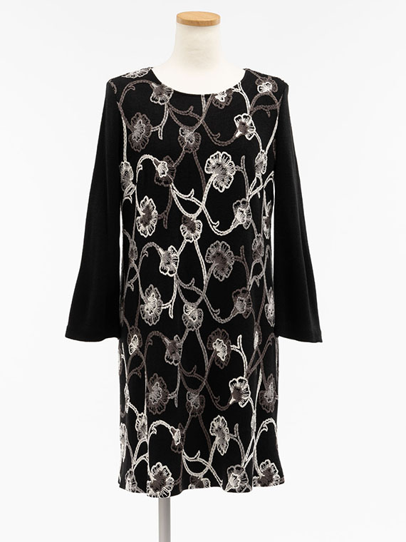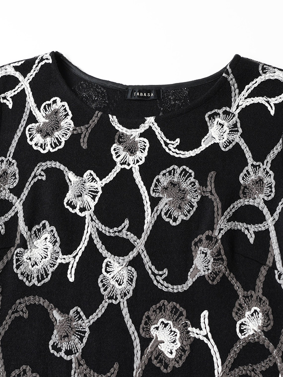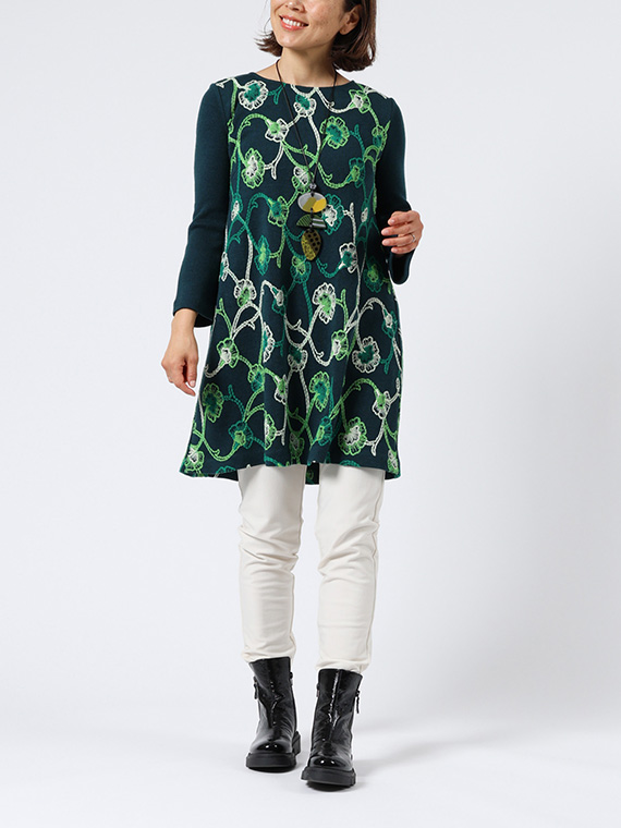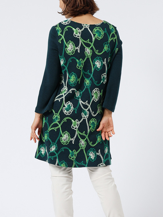 前後身頃に大胆に施されたフラワー刺繍が目を惹くAラインシルエットのチュニックです。